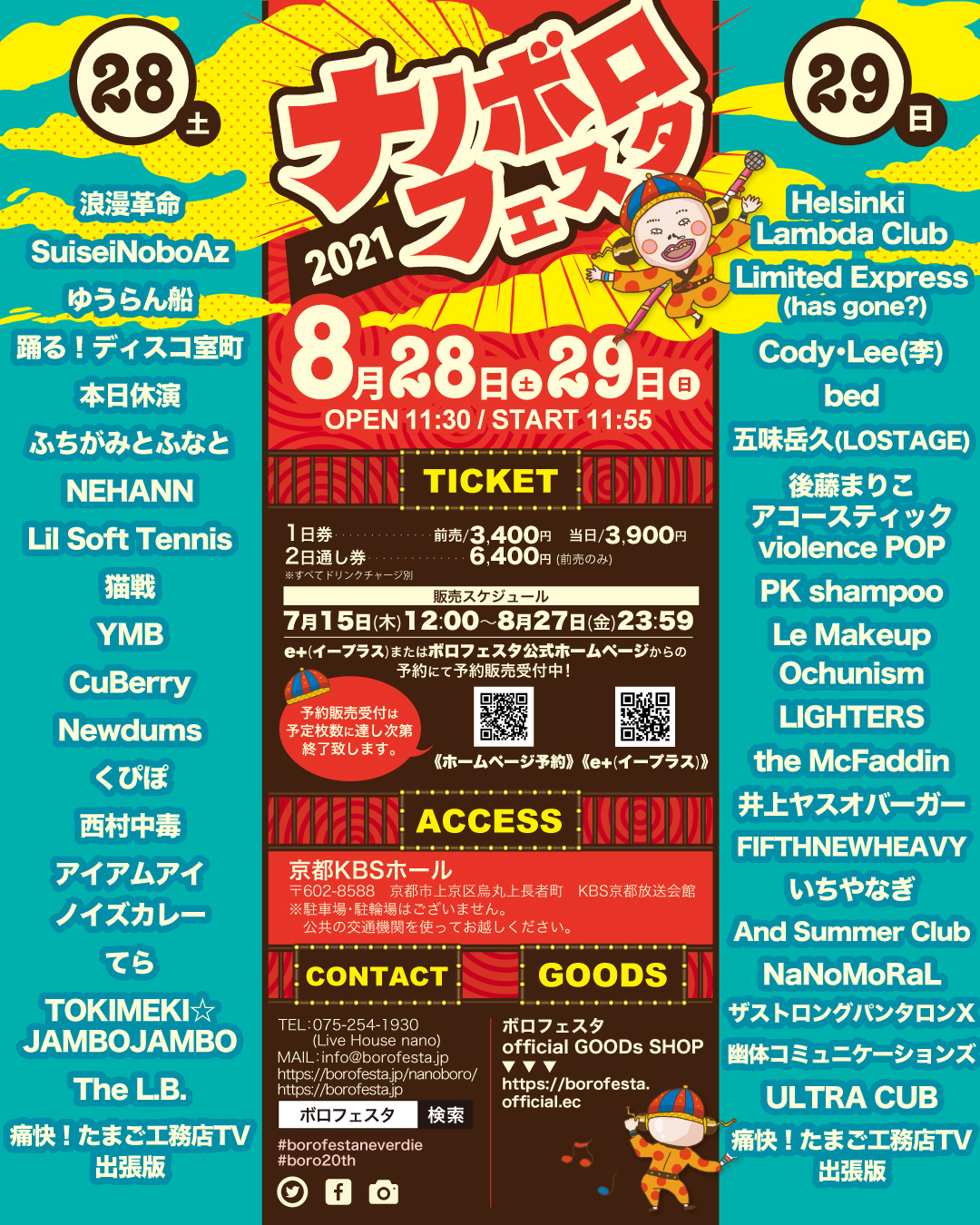 8月28日(土)、29日(日)に京都KBSホールにて開催する『ナノボロフェスタ2021』の第2弾出演アーティストと日割りが発表された。
