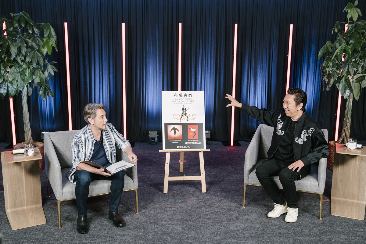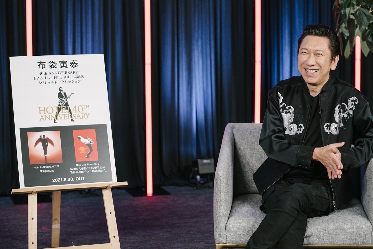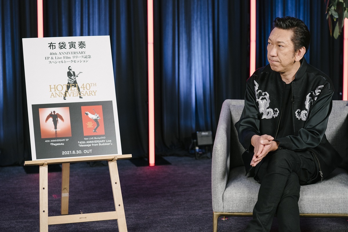 盛りだくさんのトーク内容。ラスト、MCのクリス・ペプラーからファンへのメッセージを求められた布袋。「みんな元気? 久しぶり。こうやって40周年を迎えることができました。迷ったときも、いつも信じてくれて。そんなみんながいてくれたからこそ今の僕がいると思っています。この気持ちは、音で返すのが僕の役割だと思っているので。まず4曲入りのEP『Pegasus』、そして無観客ではあったけどみんなの思いで埋め尽くされた日本武道館公演の映像を届けることができたので、じっくり楽しんでいただいて。この先も、こんな時代ではあるけれどスタッフと心を合わせて、この感謝の気持ちをいろんな形で伝えたいと思っています。」と熱い思いで答えた。