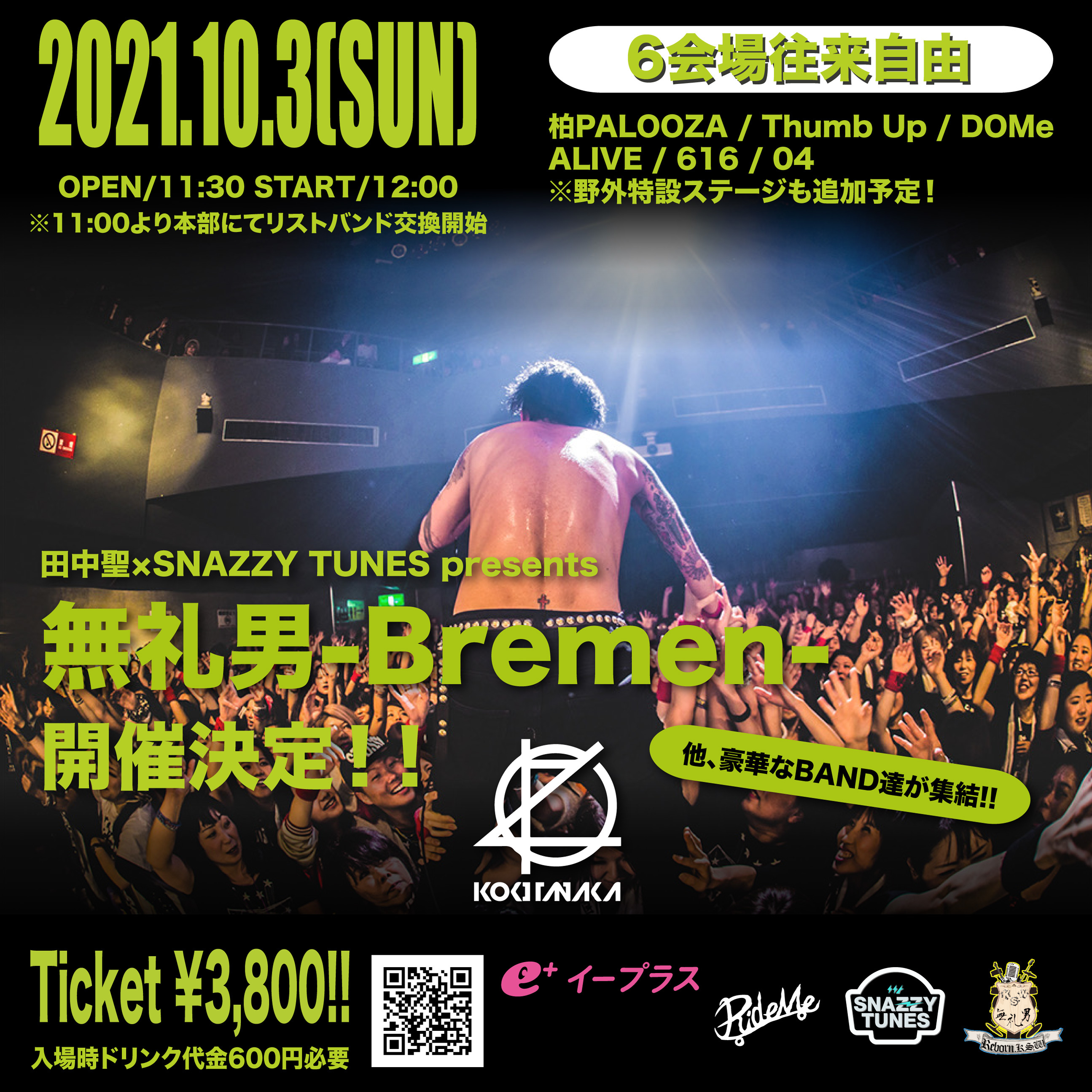 田中聖が、10月3日(日)にイベント『SNAZZY TUNES』と共同主催にて、千葉県柏の全てのスタンディングライブハウス、6店舗を使ってのサーキットフェス『無礼男-Bremen-』(ブレーメン)を開催する事が発表された。