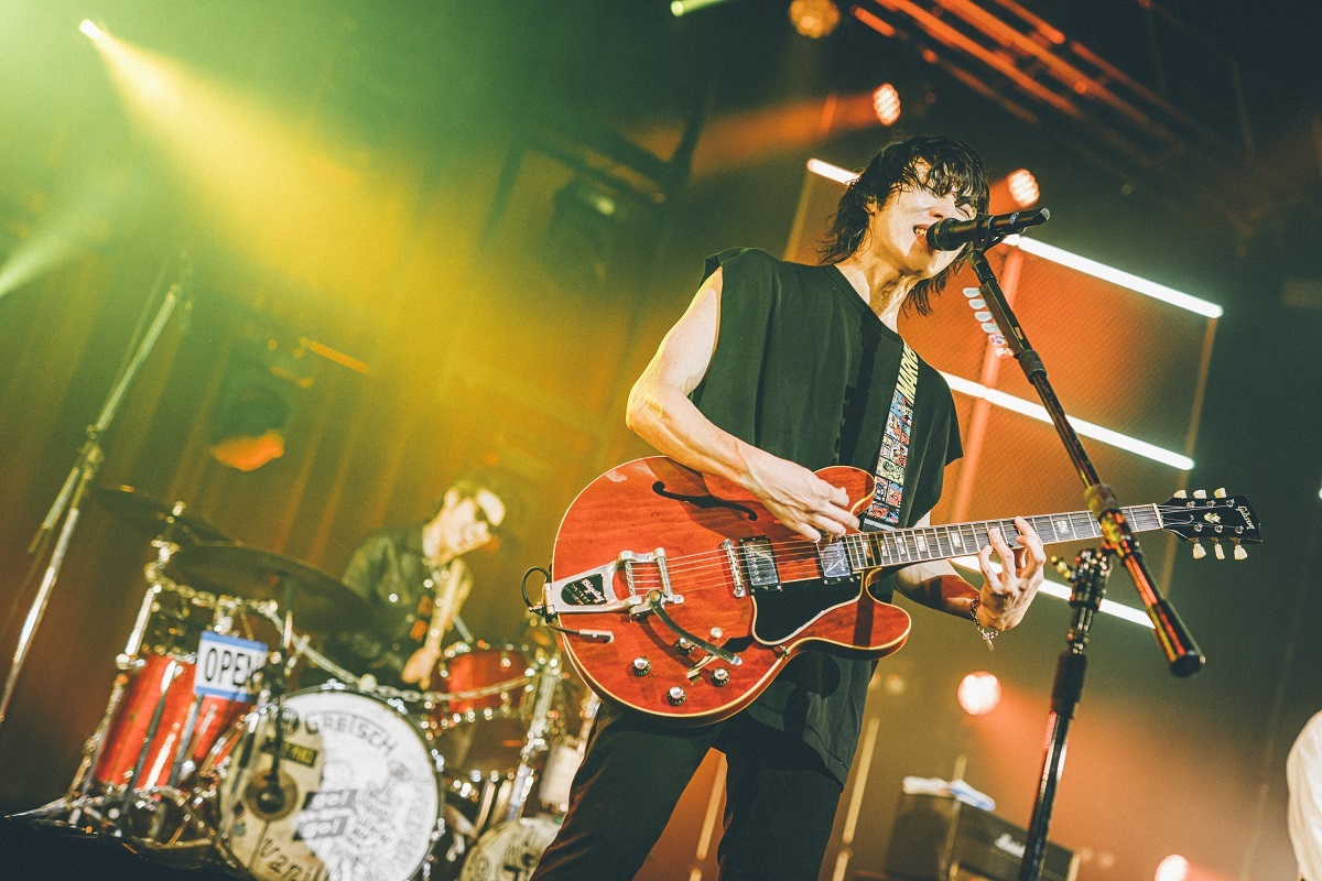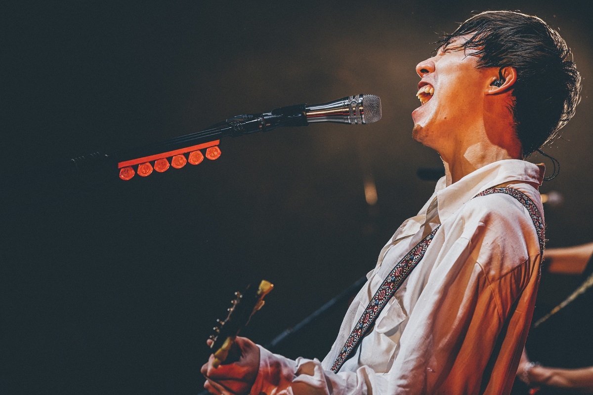 これまでのツアーとは異なり、ステージの幕が下りた状態で開演。照明の光が牧 達弥(Vo/Gt)のシルエットを浮き彫りにさせるなか、「アダムとイヴ」でライブが始まった。アルバム『PANDORA』のリード曲ながら、バンドの新機軸といえる曲調だった「アダムとイヴ」。タイトなビート、クールな照明演出が鮮烈な印象を残していく。MCで本人も言及していたので先に書いておくと、このとき牧のボーカルは本調子ではなかった。しかしそれより重要なのは、すぐにペースを取り戻してみせたこと。人の本質はピンチのときにこそ出るものだ。