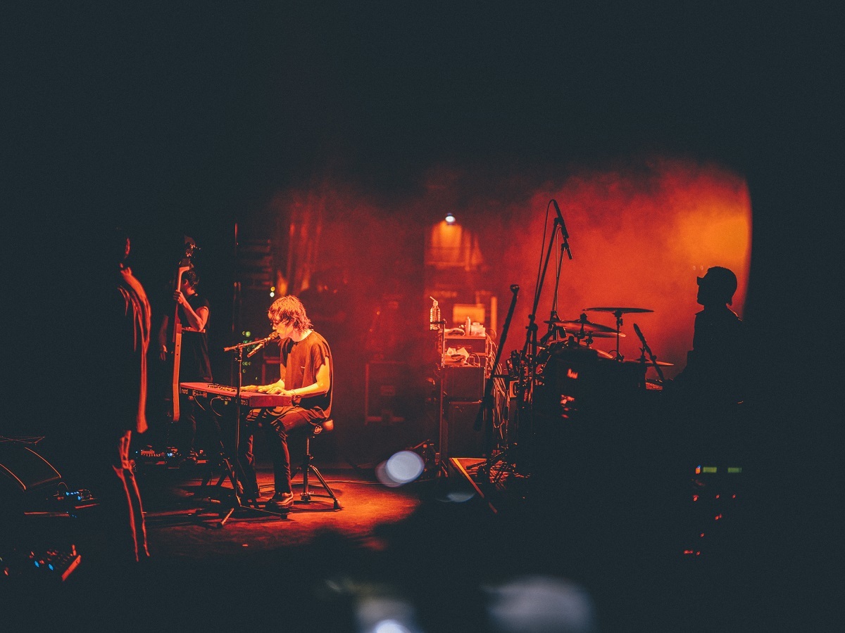 柳沢、プリティ、セイヤが曲間を繋げるなか、「俺らが音楽鳴らしてみんながこうして受け取ってくれる。そういうシンプルなことが今一番大事なんじゃないかと思います」と牧。そこから、“世の中が苦しくなるほど、夢をはじめとした不完全なもの、発展途上のものは求められなくなってしまう”、“しかしプレイヤーの体調によって音が変わるバンドのように、泥臭くて偶発的なものの方が面白い”という持論を展開。そして「ca$h from chao$」に繋げた。柳沢ボーカル曲「伺いとキス」のサイケデリックな世界観は、生で聴くとなお強烈(そしてメンバーが超楽しそう)。フォーク調のメロディに癒される「ロールプレイ」は、きっと相当訓練したのだろう、コーラスワークも美しい。