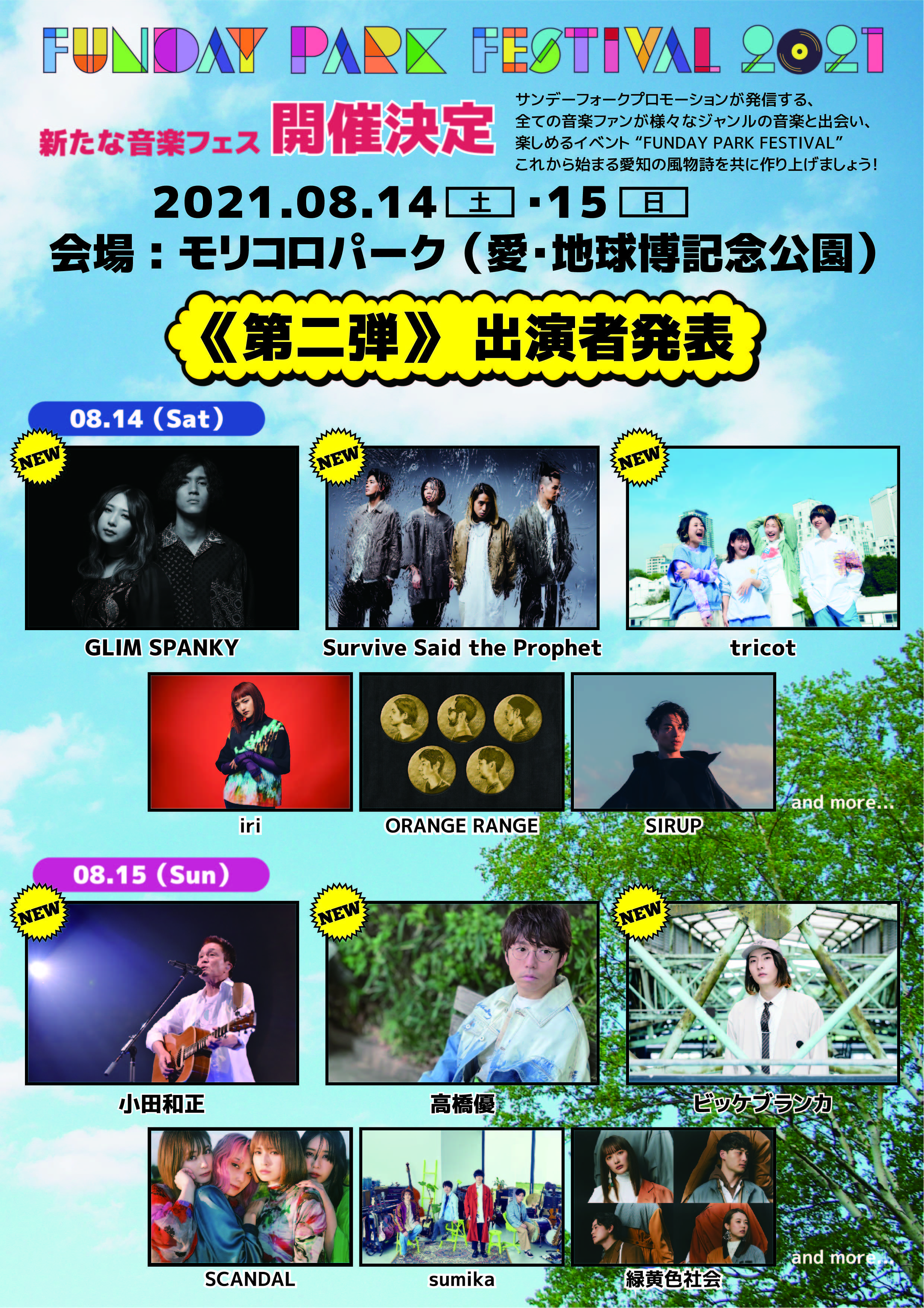 愛知県・モリコロパーク(愛・地球博記念公園)にて8月14日(土)・15日(日)に開催される新たな音楽フェス『FUNDAY PARK FESTIVAL 2021』が第二弾出演者発表をした。