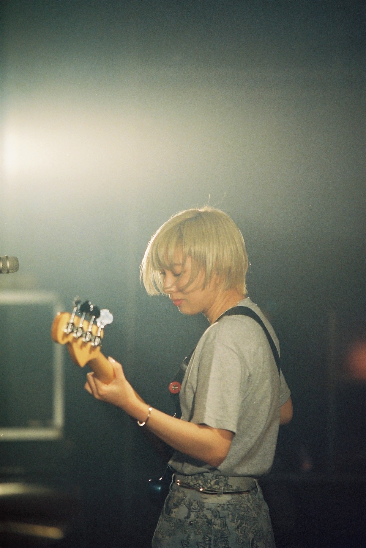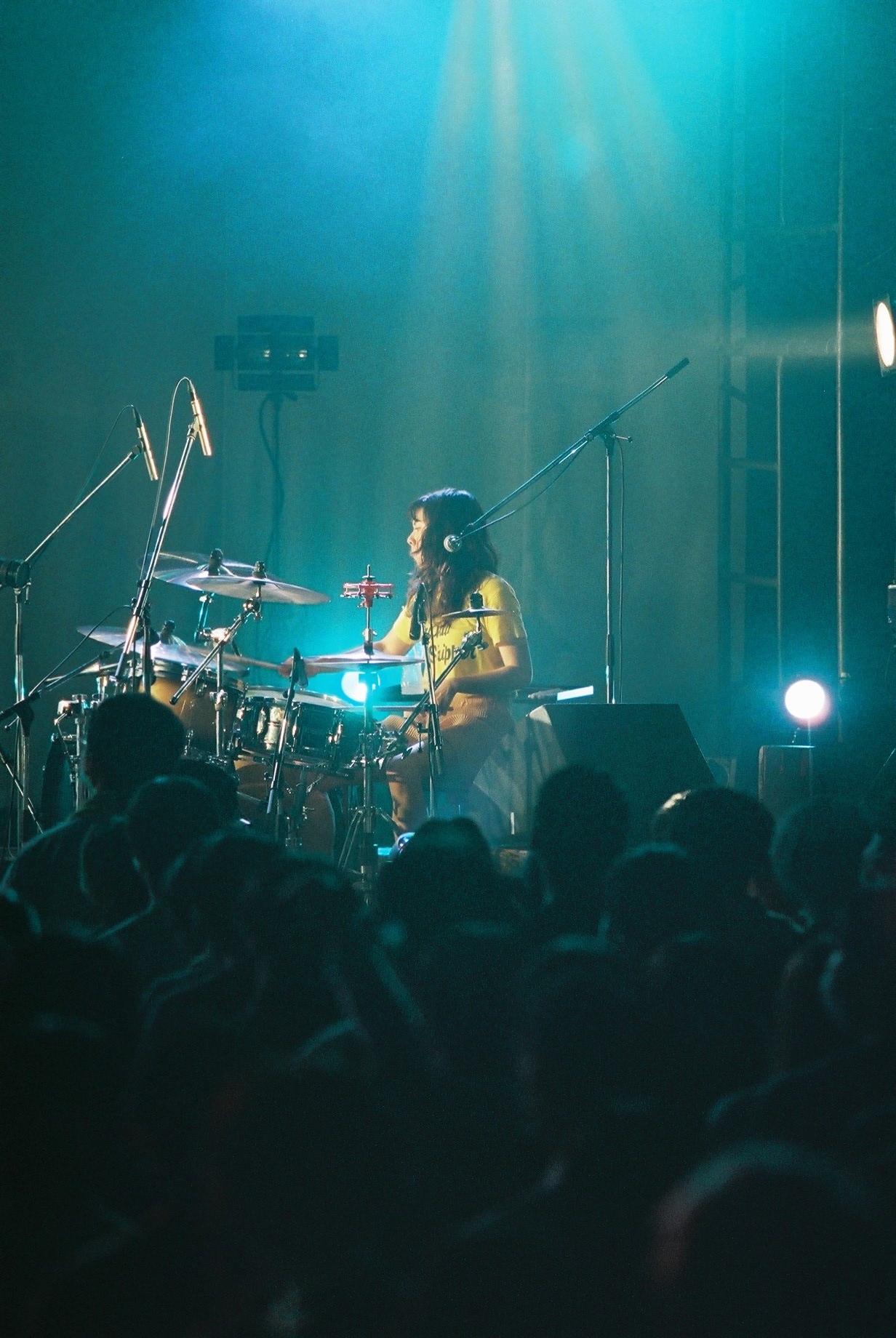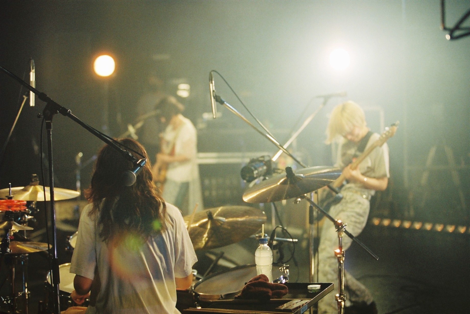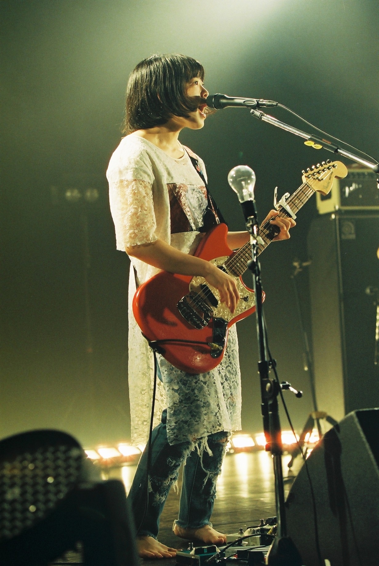 暗転したステージに現れた3人。最初に鳴らされたのは海の強烈に蠢く低音のフレーズで始まる「1997」。たかはしほのか(Vo/Gt)が東京へ降り立った=誕生を歌うナンバーからスタートするのか!と、筋の通し方に感嘆。後半の語り部分はパッと聴きダークなのだが、感情としてはニュートラルで意気揚々とこの街で生きるニュアンスが強い。3人の楽器の音が生々しくそのことを伝えてくる。続く「ジョニー」は<ばかばっかのせんじょうにギターを1つ持って>という歌い出しが、いつも以上にストーリーとして届く。アウトロでのメロディアスな海のフレージングはさらに冴えてきた。フィードバックノイズも曲の世界を作り上げる怒涛のシューゲイズサウンドの「魔女」まで、3人は今、最もしっくりくるアレンジと尺でプレイを完結し、次の曲に向かうのだが、そこでオーディエンスも妙に構えることなく、心のままに拍手を送っているのが新鮮だった。そして「教室のしかく」を終えるとたかはしが「教室を出たら〜」と学校が舞台になるような弾き語りを突如披露。その後、学校のチャイム音と共に教室内のバックグラウンド音、そして街の音に繋がり、効果的に場面転換が行われている。