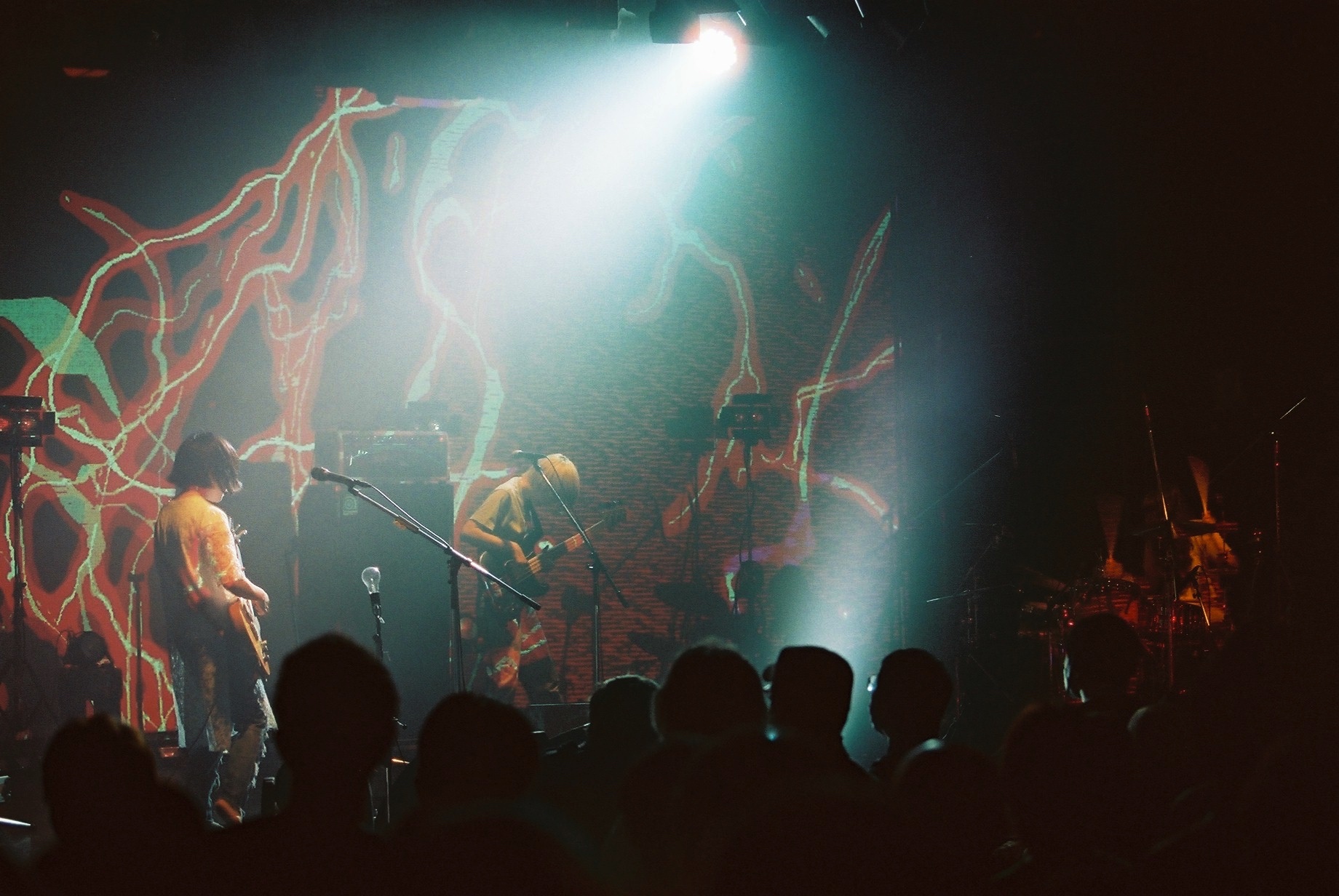 体を揺らしたくなる曲が続く後半は「林檎の花束」に始まり、ステージ背景いっぱいに星が映し出された「the tokyo tower」。星空はテレビのサンドストームのような映像やノイズに変容し、歌詞とリンクして行く。さらに今回の企画の発端でもある「東京」は3人の出す轟音から一転、クリーントーンに乗る様々な事象が別のところと繋がっているAメロの歌詞の秀逸さを伝え、サビで開かれて行く。ミュージックビデオで見られた映像もだが、<闇に撃ち放つ 僕の照明弾。>のタイミングでフロアに向けて強烈なライトの照射が演奏とリンクして、ここにいる私たち一人ひとりの存在が浮かび上がった感じだ。エクストリームな映像の演出に演奏が負けていないのもいい。