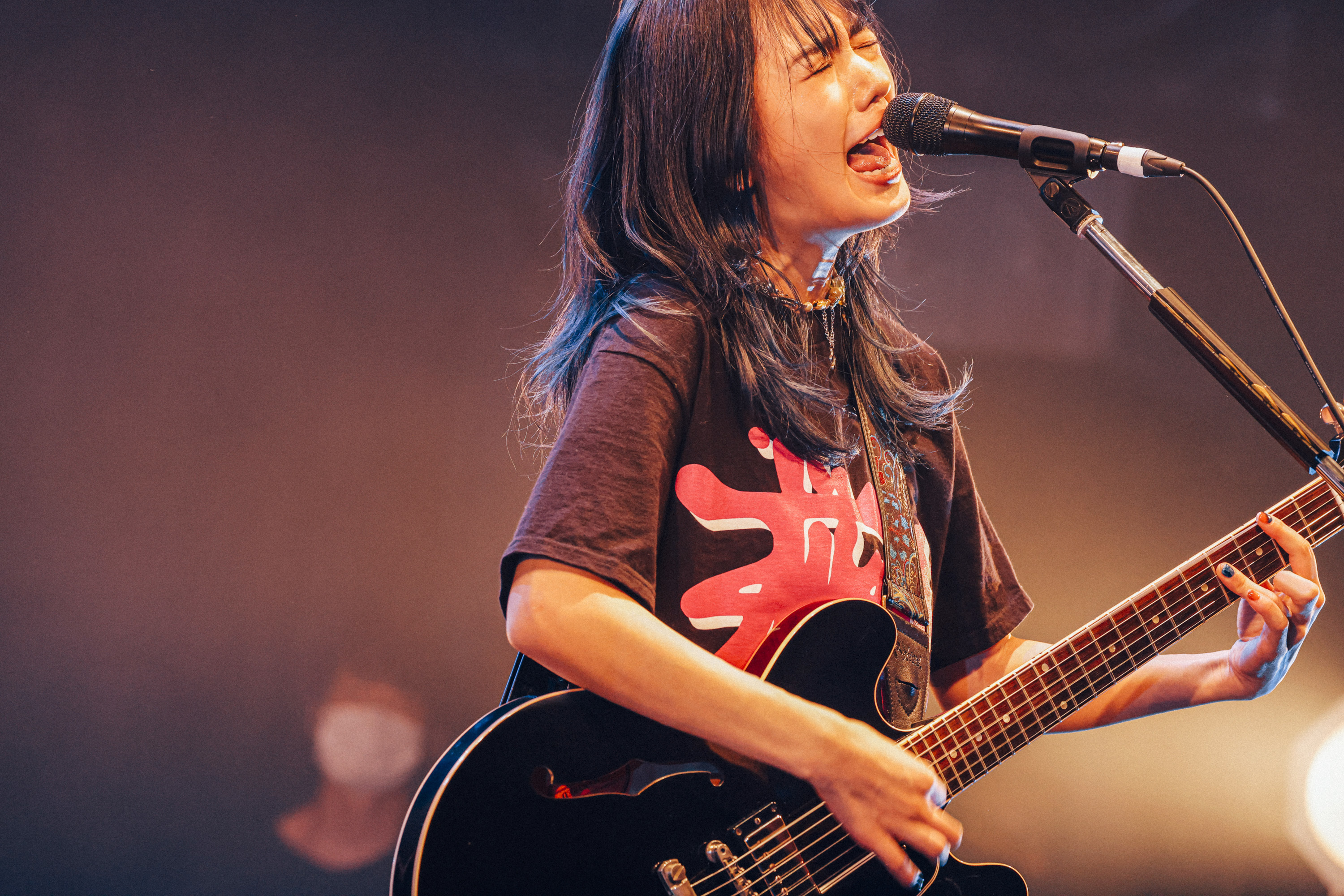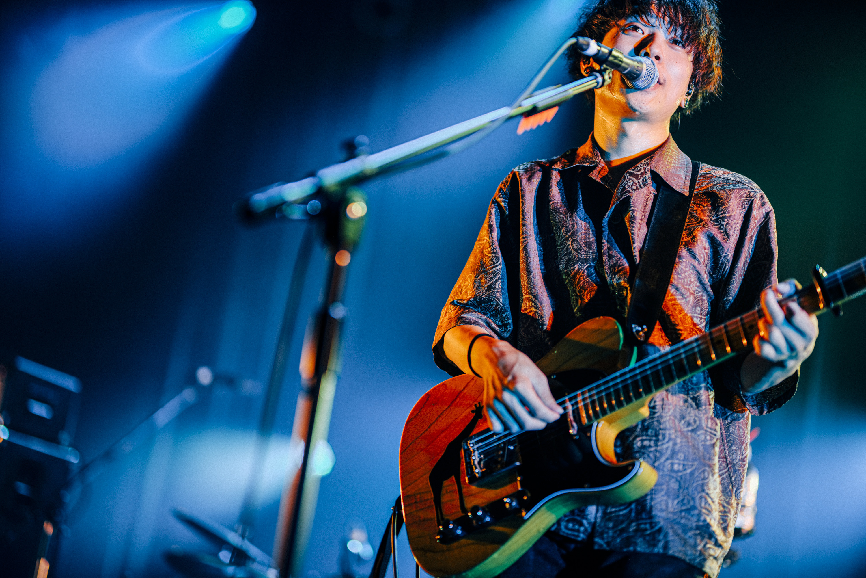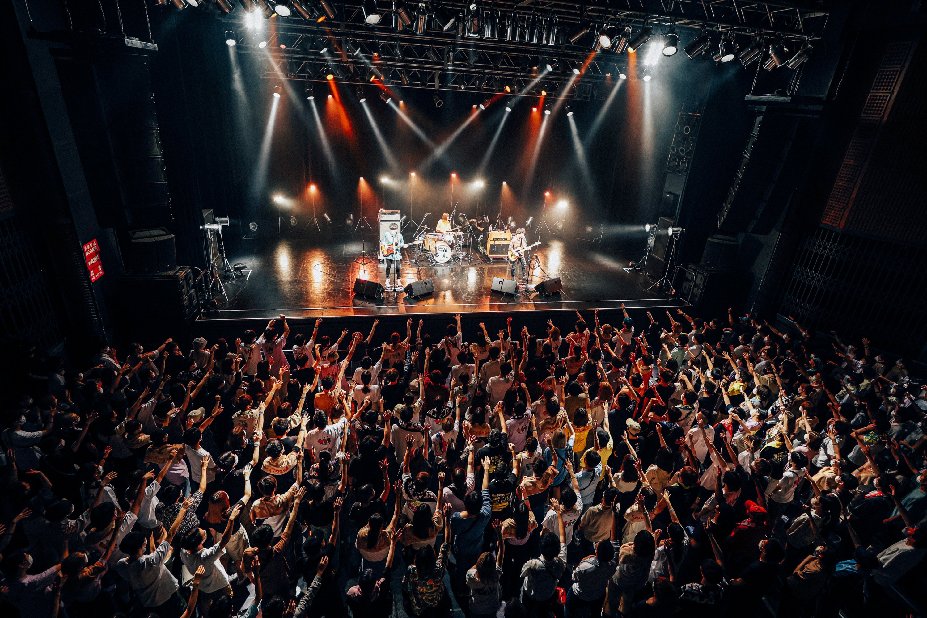 幕開けは「真昼の月」。胸の奥がキュンとなるみずみずしいメロディが軽やかに流れ出す。伸びやかで疾走感のあるサビのフレーズが繰り出され、すぐにフロアは暖まった。「楽しんでいきましょう!」を石原が声を挙げ「雀ノ欠伸」に。優しいメロディに乗せて届く「君の良い所はみんな知ってるよ」「自分らしく歩いて行こう」と背中を押すメッセージが、コロナ禍のうっぷんが溜まった胸に響く。「盛り上がって行こうぜ!」と叫ぶ石原に観客が大きな拍手で応える。轟音のイントロから引き込む「ナイトクロージング」では、スリーピースバンドとは思えない表情豊かなバンドアンサンブルで達者ぶりを見せる。