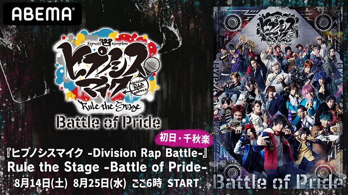 『ヒプノシスマイク -Division Rap Battle-』(以下『ヒプマイ』)の舞台初となるLIVE『ヒプノシスマイク -Division Rap Battle-』Rule the Stage -Battle of Pride-が、「ABEMA PPV ONLINE LIVE(アベマ ペイパービュー オンライン ライブ)」にて、2021年8月14日(土)18時からの初日公演と、8月25日(水)18時からの千秋楽公演を生配信することがわかった。