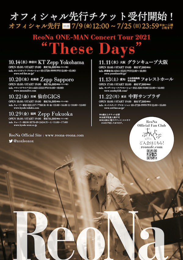 さらに、今年の秋から全国7か所をまわるライブハウス&ホールツアー『ReoNa ONE-MAN Concert Tour 2021 "These Days"』の開催も決定。7月9日正午からチケットオフィシャル先行も開始された。