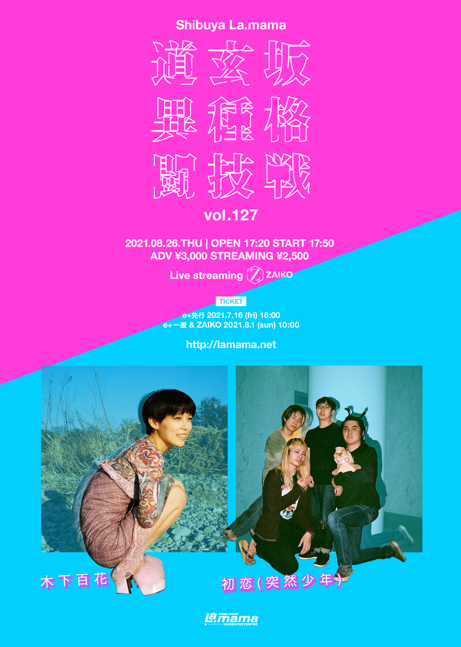 8月26日に渋谷La.mamaにて木下百花と初恋(突然少年)の2マンライブが開催される。定期的に開催されている名物イベント『道玄坂異種格闘技戦』にて、有観客(80名限定)+配信という形で行われる予定だ。