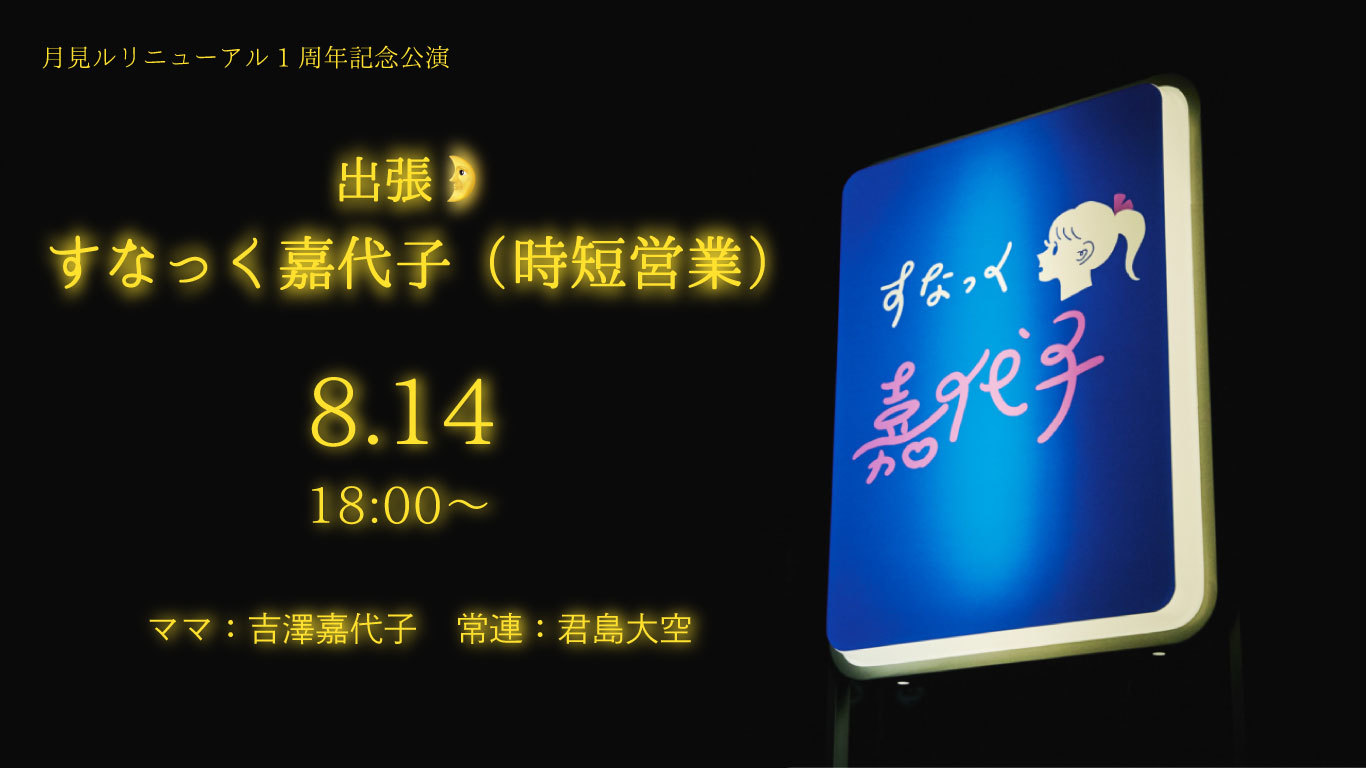 昨年、吉澤嘉代子が初めて開催した配信ライブ『すなっく嘉代子』が、リニューアル1周年を迎えた“青山 月見ル君想フ”で出張時短営業をすることが決定。今回も常連の君島大空とともに、演奏ありお喋りありのライブをお届けする。