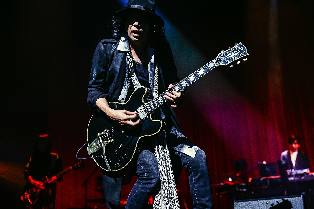 シャッフルの跳ねるリズムとマイナーに転調するサビのギャップにハッと気持ちを持っていかれる「Shining On」。NAOKIが奏でるエキゾチックなギターリフが、まさにレッド・ツェッペリンオマージュな「Rain」。ともにLOVE PSYCHEDELICOのマニアックな志向が色濃く表れた2曲がNAOKIによる奔放なギターソロとともに会場の熱をぐっと上げたことは言うまでもない。