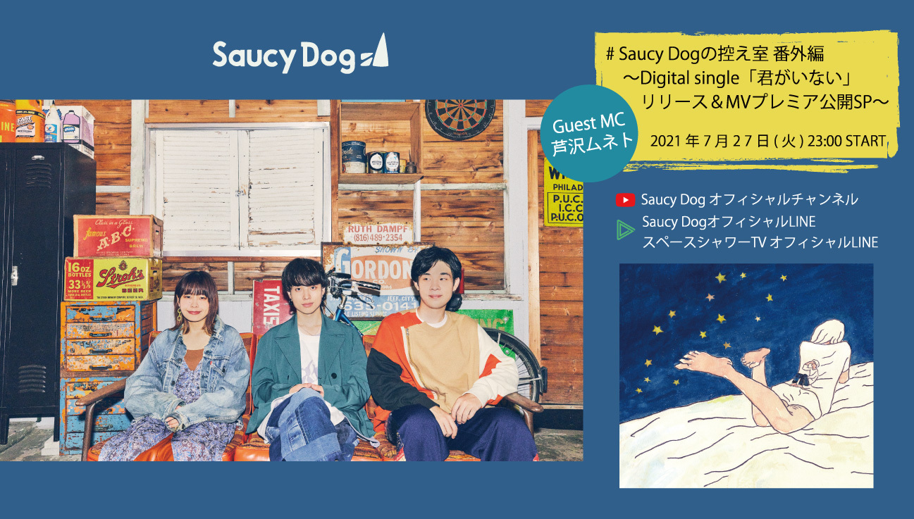 また、「君がいない」のMUSIC VIDEOが7月28日(水)0:00よりYouTubeプレミア公開される。MVプレミア公開に伴い、配信シングルリリース前夜7月27日(火)23:00から『Saucy Dogの控え室番外編〜Digital Single「君がいない」リリース&MVプレミア公開SP〜』の生配信が決定。Saucy Dog、スペースシャワーTVの公式LINEアカウント、Saucy DogのYouTubeオフィシャルチャンネルで配信され、番組のMCはSaucy Dogの控え室番外編ではお馴染みとなっている芦沢ムネトが担当する。