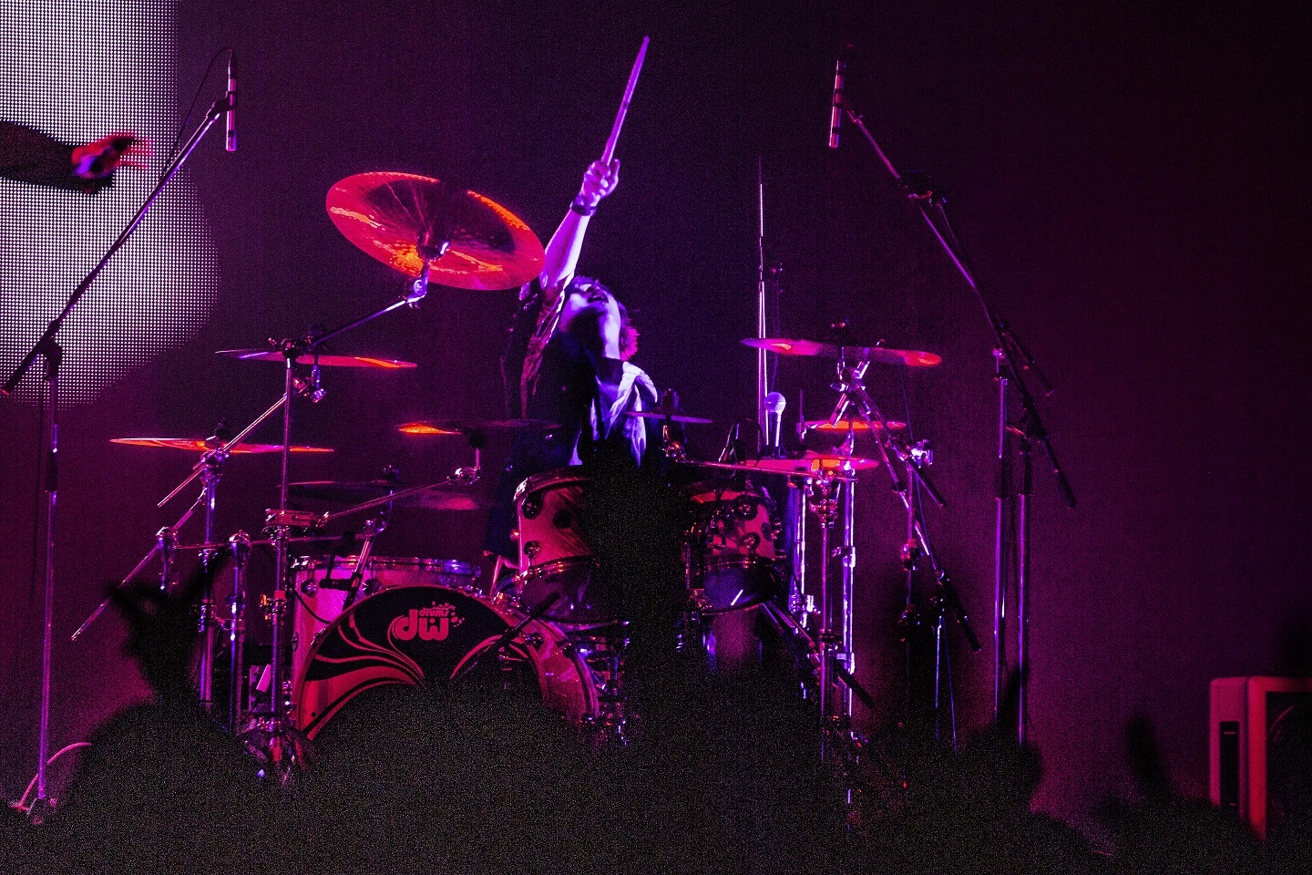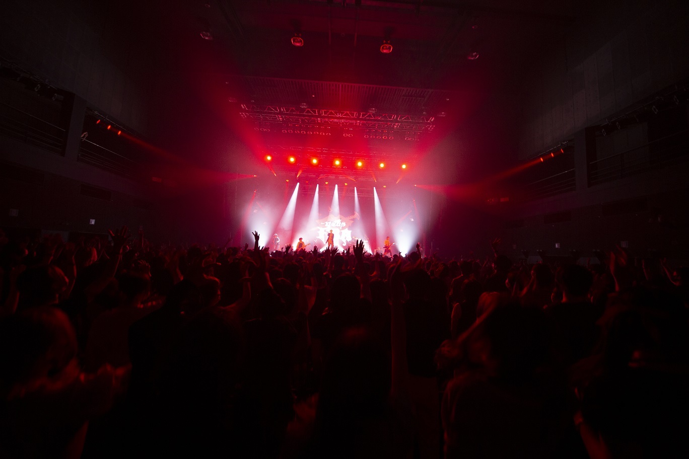 機材トラブルも解消され、ライブは後半に入りボルテージを上げ暴れ曲の定番「FIVE BARKIN ANIMALS」へ。「DANCE IN THE DARK」ではお立ち台で踊る智やTohya(Dr)に向かい合ってプレイする瑠伊など、ステージも暴れ倒す。「Timer」「星一つ灯らないこんな夜に。」とアップテンポの曲目を立て続けに演奏し、ステージも客席もボルテージは最高潮に。声援こそ送れないものの、その分全身で応援を送る客席の様子に、智も「“暴れたがり”が多いからね」と笑っていた。