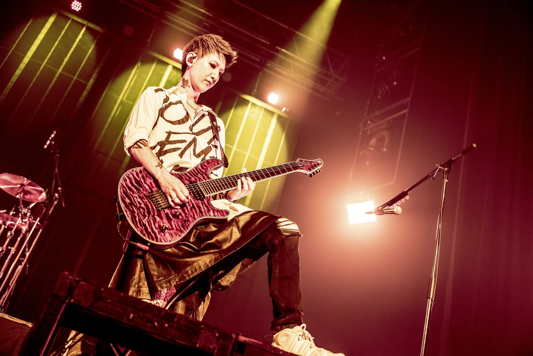1曲目の「John Doe」が鳴り始めると、手をヒラヒラさせる手扇子でステージへの熱を伝えていた。「EDY」ではYuh(Gt)が早速フライングVに持ち替えてギターソロを披露。たくさんのキッズの手が挙がり、プレイに釘付けに。彼のギターヒーローぶりを体現した形になった。