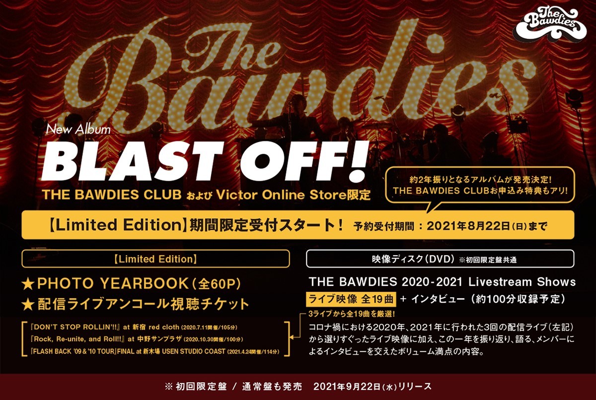 また、THE BAWDIES CLUBとVictor Online Storeでは【Limited Edition】の予約を受付中。初回限定盤に全60Pのフォトイヤーブックと、3回の配信ライブのフル視聴チケットを付属した豪華商品となっており、受注期間は8月22日(日)までとなる。