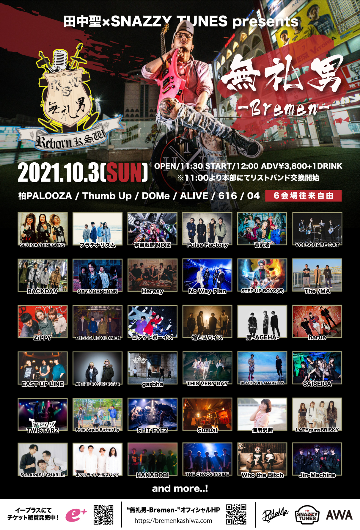 10月3日(日)に開催される、田中聖が地元柏を盛り上げるべく立ち上げたサーキットフェス『無礼男-Bremen-』の第1弾出演者が36組発表された。