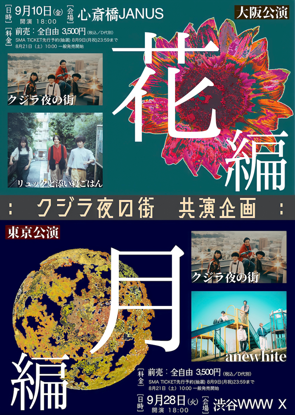 今回が初めてとなる大阪と東京の二本立て公演として、9月10日の大阪公演『花編』にはリュックと添い寝ごはん、9月28日の東京公演『月編』にはanewhiteの出演が決定。