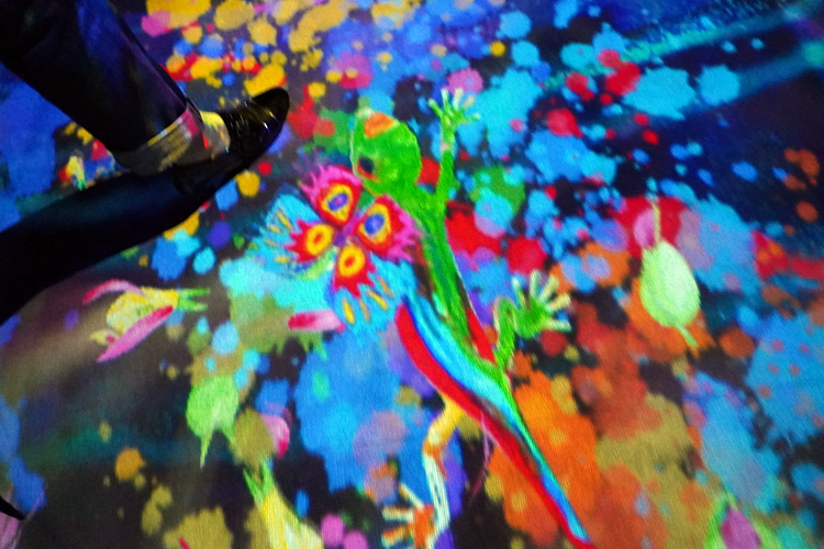 《グラフィティネイチャー》では、広い空間に自分の描いた絵が現れ、生態系の中で活動をはじめる。足で触れると反応があるので、動き回って確かめてみよう。