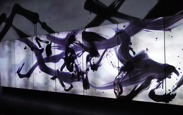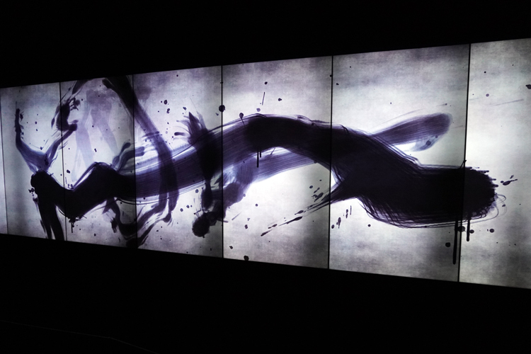 《反転無分別、境界を越えて描かれる》は、空書(チームラボが設立以来書き続けている、空間に描かれる書のこと)が空間に描かれる作品だ。ディスプレイに収まっていた空書は、枠をはみ出して一筆が伸びていく。