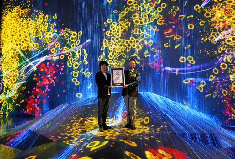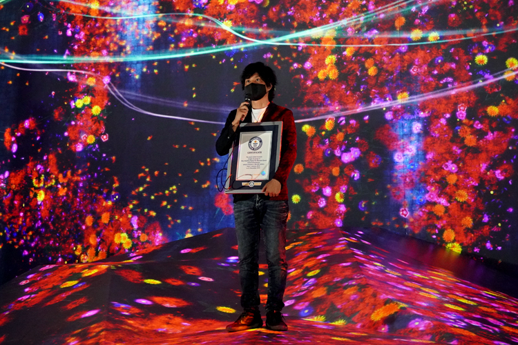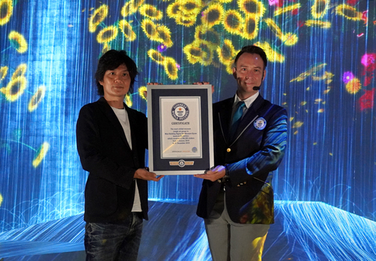 認定式には、ギネス世界記録公式記録員のジャスティン・パターソン氏が登壇、2019年の来館者219万8284人が記録認定された旨を述べ、チームラボの松本明耐氏に認定証を授与した。松本氏は「とても光栄に思っている。たくさんの人に来館いただいて達成できた」と喜びを語り、また「これからもアートを通じ、世界と境界の認識を模索し続けていきたい」と抱負を示した。