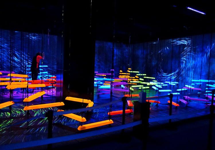 暗闇に蛍光色のブランコが浮かんでいるように見えるのは《タイフーンの上のエアリアルクライミング》だ。色とりどりの棒がロープで吊られており、人が乗ると棒同士が影響しあうので、揺れのスリルを味わえる。