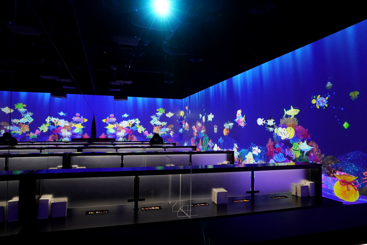 《世界とつながったお絵かき水族館》では、描いた魚が水族館で泳ぎまわる。中でもマグロは、他国の《お絵かき水族館》や《スケッチオーシャン》まで泳いでいくことが可能だ。内覧会の日も、上海にある『チームラボボーダレス』の《スケッチオーシャン》から来たと思しきマグロがいた。