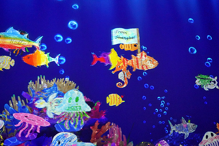 《世界とつながったお絵かき水族館》。「from shanghai」と書かれた旗を持つマグロがいる。