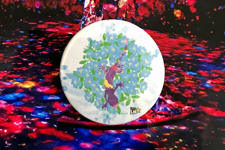 《グラフィティネイチャー》で描いた花の絵に、別スタッフの描いたトカゲを組み合わせて缶バッジに。なお、イラストのデザインはどれも素敵なので、絵に自信がなくてもまったく問題ない。