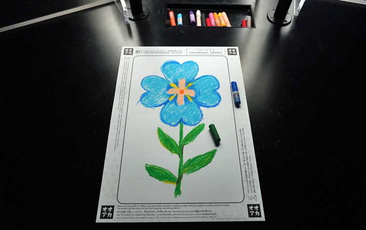 《グラフィティネイチャー》や《世界とつながったお絵かき水族館》では、生きものが描かれた紙にお絵かきをしてスキャンすると、自分の絵を作品空間に登場させることができる。