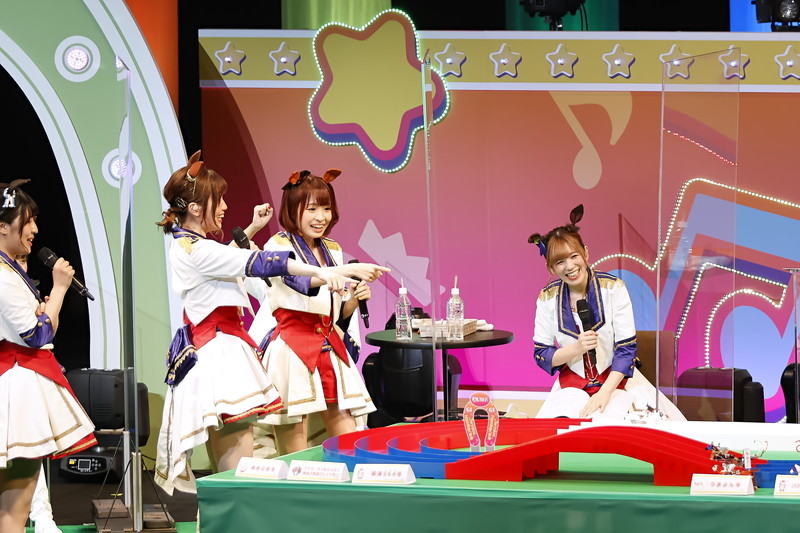 トレセン学園のジャージに身を包んだ、両チームとも縁の深い四人のキャストがレースに挑むので、その着順を予想してポイントを競うことに。チーム「仲間で☆ライバル」の予想を任された衣川&星谷は「姉貴を信じるのは私しかいないので」(衣川)とナリタブライアンの姉・ビワハヤヒデ役の近藤を1位に。一方のチーム「温度差」の予想をするメジロパーマー役・のぐちは「うちのヘリオスは4着です!」と相棒の最下位を予想。そして今回が『ウマ娘』として初稼働となる遠野の「えいえいむん!」に期待するカノープスの仲間の推薦でマチカネタンホイザ役・遠野を1位と予想。会場のファンの拍手による1位予想はゴールドシップ役・上田瞳と出そろったところで、いよいよレースがスタート。