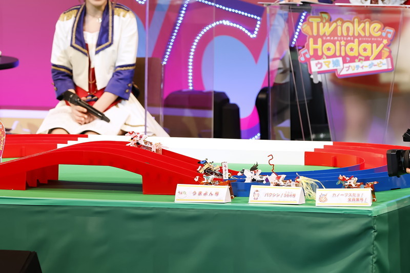 続いての第2レースでは、チーム仲間で☆ライバルは「そろそろ瞳さんを信じてあげます?」ということで「バクシン!564号!」を、そしてチーム「温度差」は「さっきのレースでも勝ったしお寿司がたくさんついててめでたい」と「カノープスだョ! 全員集号!」を1着に予想。そしてレースは三頭がデッドヒートを演じながらも「うまよん号」以外の二頭はネジが外れるなどのトラブルで力尽きるというカオスな結果に。
