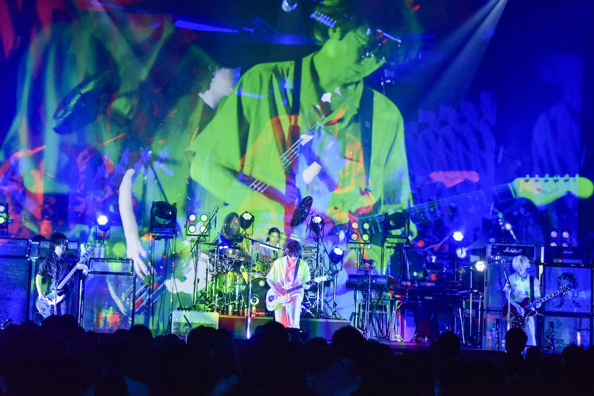 赤いスポットライトに照らされた川上のジャズマスターのカッティングからのインスト曲で、この日を待ち侘びたオーディエンスの情熱とじっくりギアを合わせたところで「For Freedom」炸裂! バンド初期からのキラーナンバーが、リアドの強靭なビートとともに新たな野性を獲得し、2021年の“今”を震わせる。コロナ禍の情勢下でもあり、座席スタイルながら総立ちのフロアからは歓声もシンガロングも巻き起こることはない。それでも、「Are you ready to rock & roll, Osaka?」の川上のシャウトに拍手で応える会場は、すでに確かな充実感と高揚感に満ちあふれている。白井眞輝(Gt)の多彩なギタープレイも光る「Boo!」では速射砲の如き歌のリリックが舞台後方のビジョンに躍り、サイレンのような真っ赤の照明の中「飛び跳ねようぜ! 思う存分飛び跳ねて騒ごうぜ!」(川上)と雪崩れ込んだ「Girl A」では、強靭なリフと雄大なサビのメロディで観る者すべての想いをロックの地平へと開放していく。最高の瞬間だ。