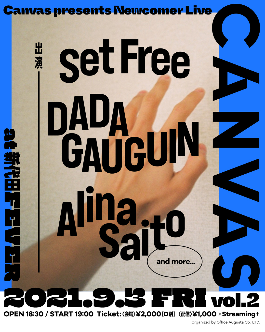 なお、第2弾イベント『CANVAS vol.2』のラインナップは、Set Free、DADA GAUGUIN、Alina Saito、新進気鋭なアーティスト3組とデモテープ受付から1組。デモテープ受付からの出演者は追って発表されるとのこと。会場チケットは明日・8月4日(水)よりe+にて販売開始。