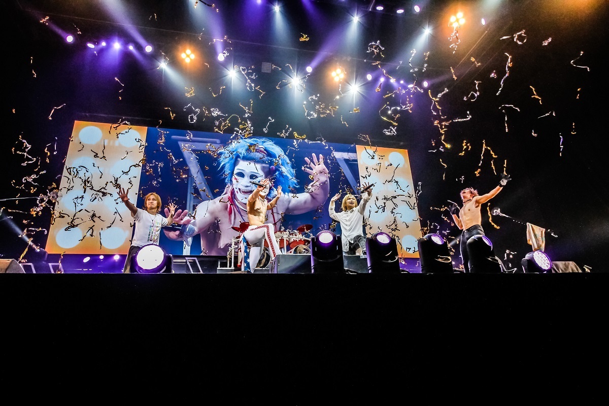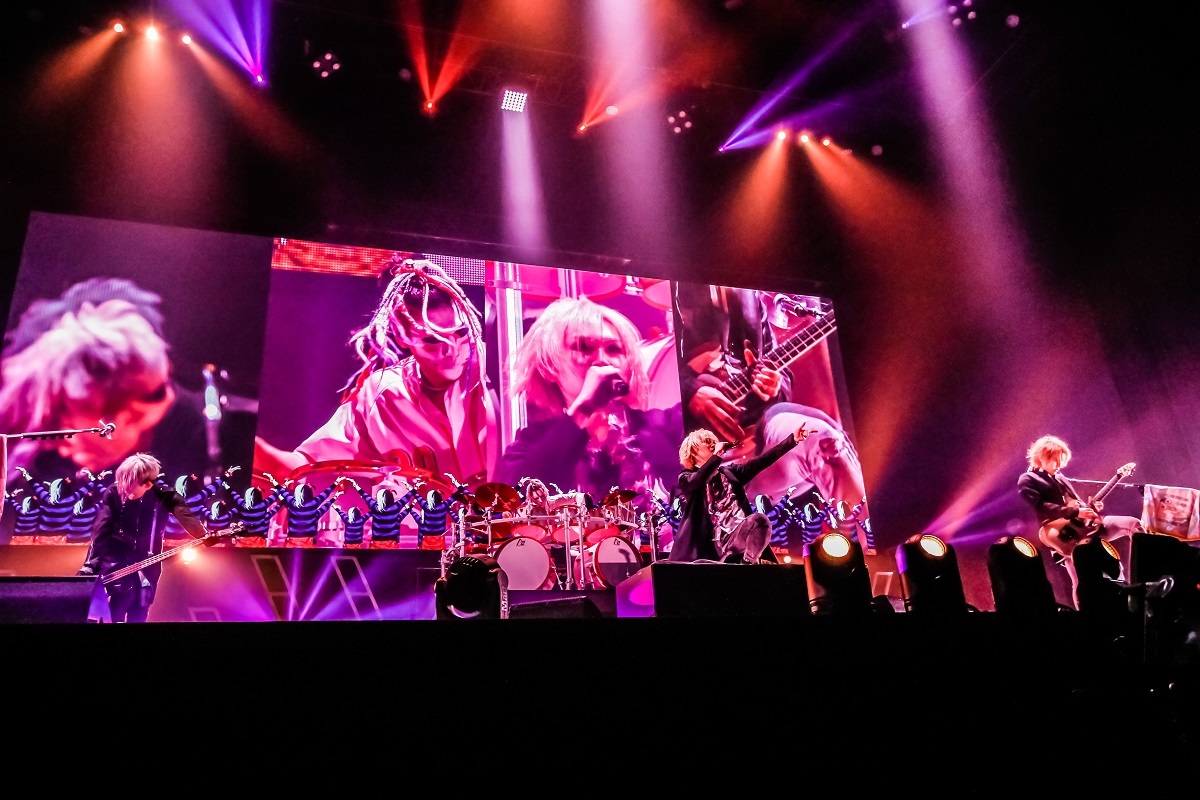 「首が痛い」、「毒グモ女(萌え燃え編)」、「かまってちょうだい///」というヴィジュアル系らしい曲たちは、首を押さえたり、コブシを突き上げたり、ジャンプしたり、声を出さなくても楽しめる曲でもあって。彼らの想いを受け取った観客は、いつもより高いジャンプ、力強いヘドバンで体いっぱいに喜びを表現、会場は一気に熱くなる。そして「絶対に被ってはいけない熱々ローションパーティーゲーム」と題された映像パートでは、白ブリーフ姿の4人が熱々ローションを頭に乗せて、ドッヂボールやボクシングなどを行い、ローションが溢れるたびに悶絶、非常に熱くなるのであった。