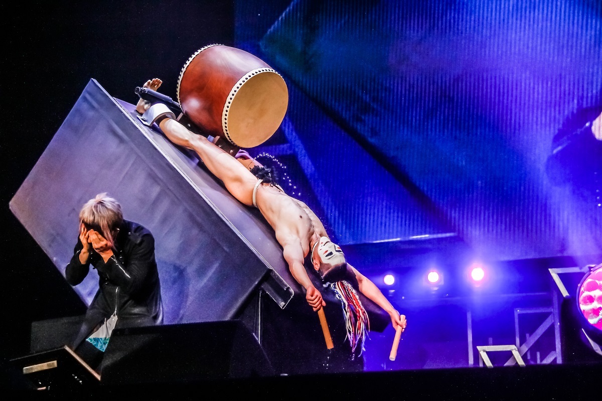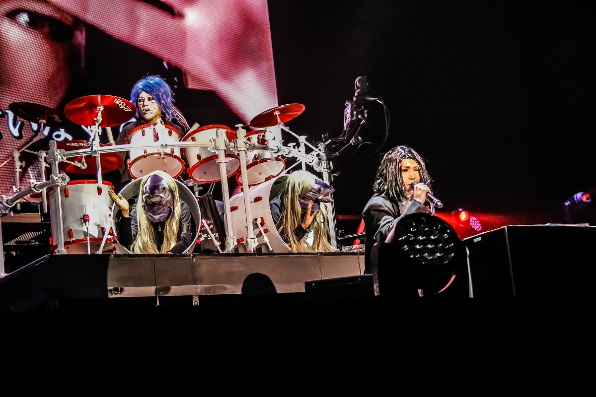 キスミー! 鬼龍院のいつもの挨拶からメンバー紹介がスタート。喜矢武は自ら、役者もやってますアピール。主役級の大役が来るかも!? などと夢を膨らませる一方で、流行に乗って「ポケットから淳(キュン)です」と軽く自己紹介するも、イヤな汗をかくはめになる歌広場淳(Ba)。日本の素敵な文化、腹筋太鼓に挑戦すると樽美酒が声を弾ませたら、そのまま「抱きしめてシュヴァルツ」へ。ギターソロでは“大役”ならぬ“鯛役”を手に入れた喜矢武が登場し、腹筋太鼓に挑む樽美酒は、傾斜の付いた台からスルリと足が抜け、着ていた衣服もうまいこと脱げて、全裸に見えるパンイチ姿に。さらに失神太鼓からの失禁太鼓?!