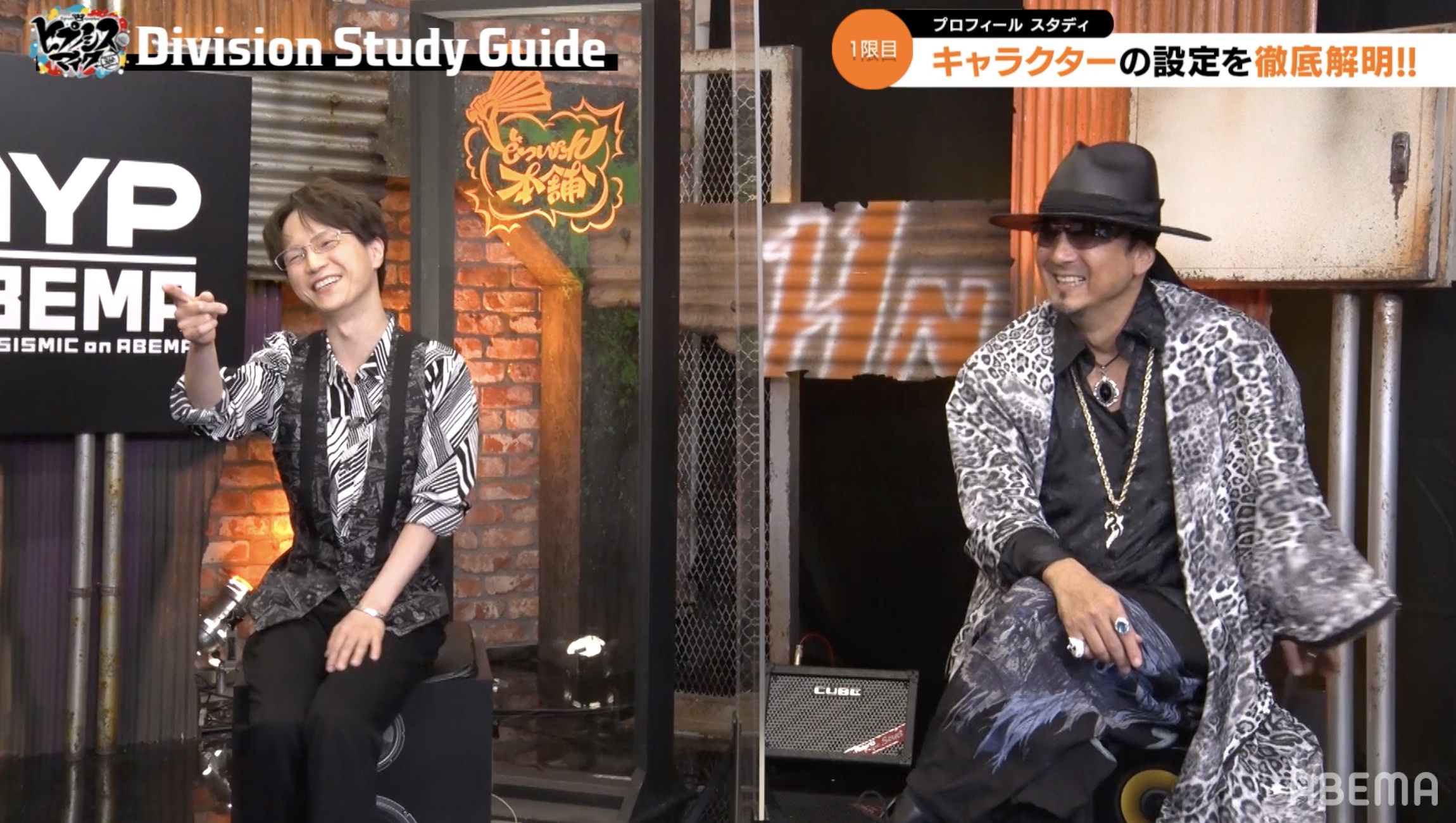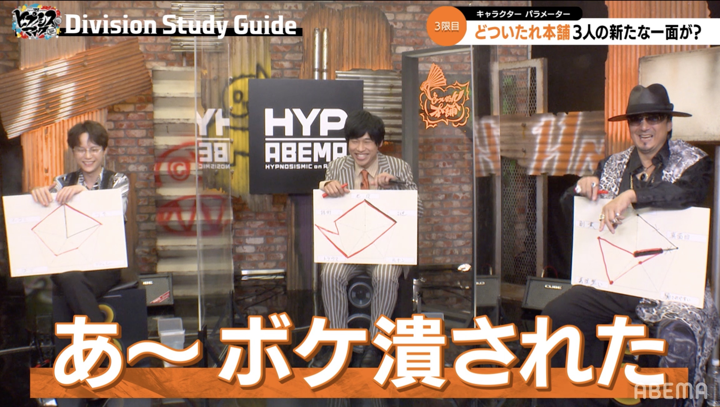 授業形式でオオサカ・ディビジョン“どついたれ本舗”を深掘りした本放送。まずは、「ディビジョンプロフィールスタディ」で各メンバーのプロフィールを学んでいくことに。白膠木 簓の「職業:お笑い芸人」「天才的な話術で人を笑わせる」や、躑躅森 盧笙の「数学の教師」「簓は漫才コンビの元相方」、天谷奴 零の「自称・詐欺師」「ヒプノシスマイクを開発」といったプロフィールが紹介されていくなか、進行役の岩崎がボードの隠された部分を問題形式で出題すると、ここは笑いの“オオサカ”らしく大喜利合戦へ発展。