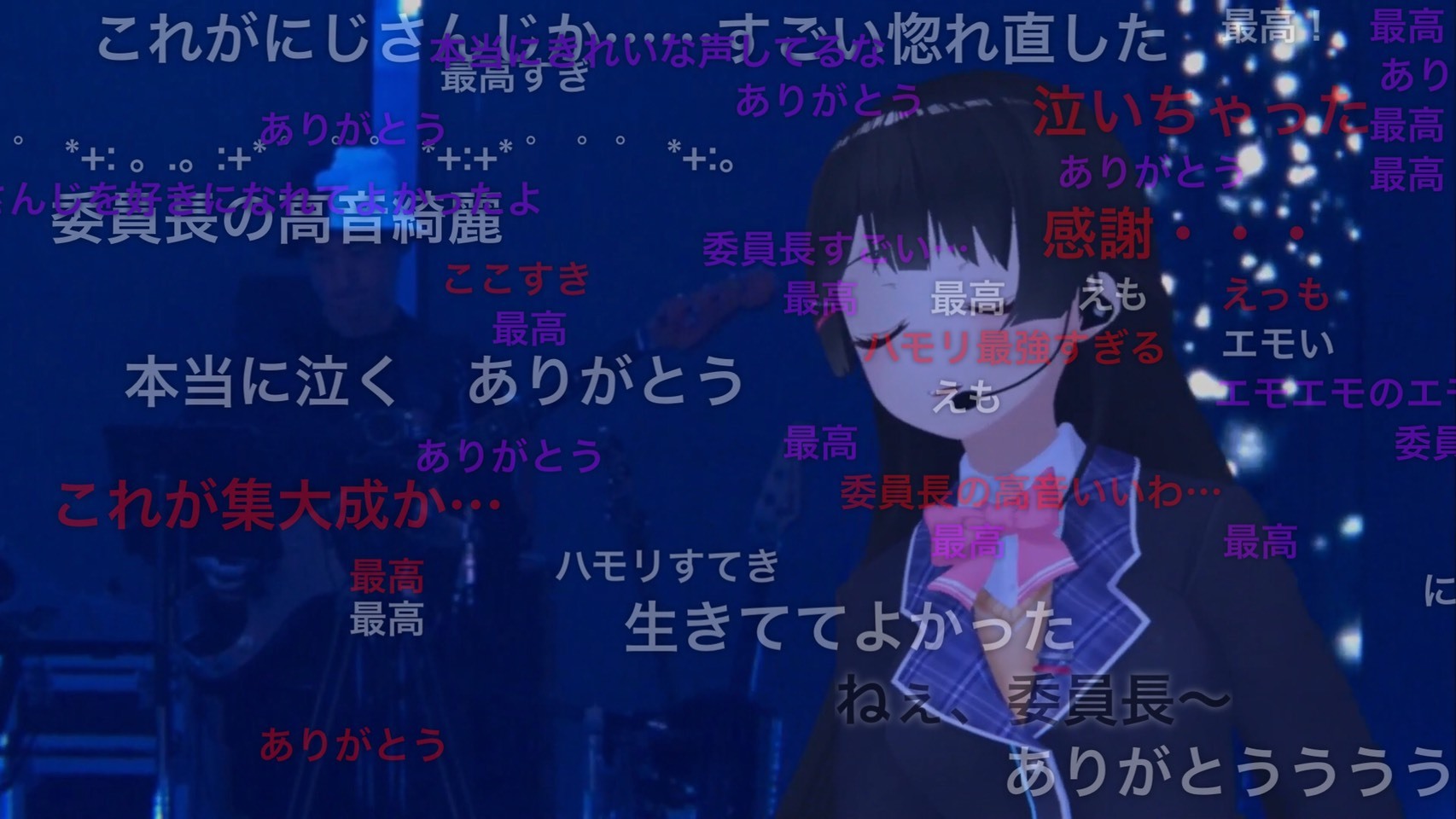 余韻に浸っている間もなくライブも後半戦に差し掛かり、再びMCパートへ。初ライブとなるりりむとデュエットしたダーリンダンスは振り付けも難易度が高いが「初ライブでアレはすごい!よくやってたよ!」と委員長が褒め、剣持も「日々のボイトレの成果がちょっとずつ出てます!」と自身のアクトを振り返った。話題は椎名やりりむ、叶といった各自のアップデートされてた3Dモデルへと移り「実はボクもこの呪われし装備(竹刀)を外す時が来たか…と思ったんですけど、外したら見た目的に寂しくなっちゃって(笑)」とアプデしそこねたことを明かす。8月11日に発売予定の委員長の1stアルバムの話にも触れた所で、次の曲はそんなニューアルバムから1曲披露。