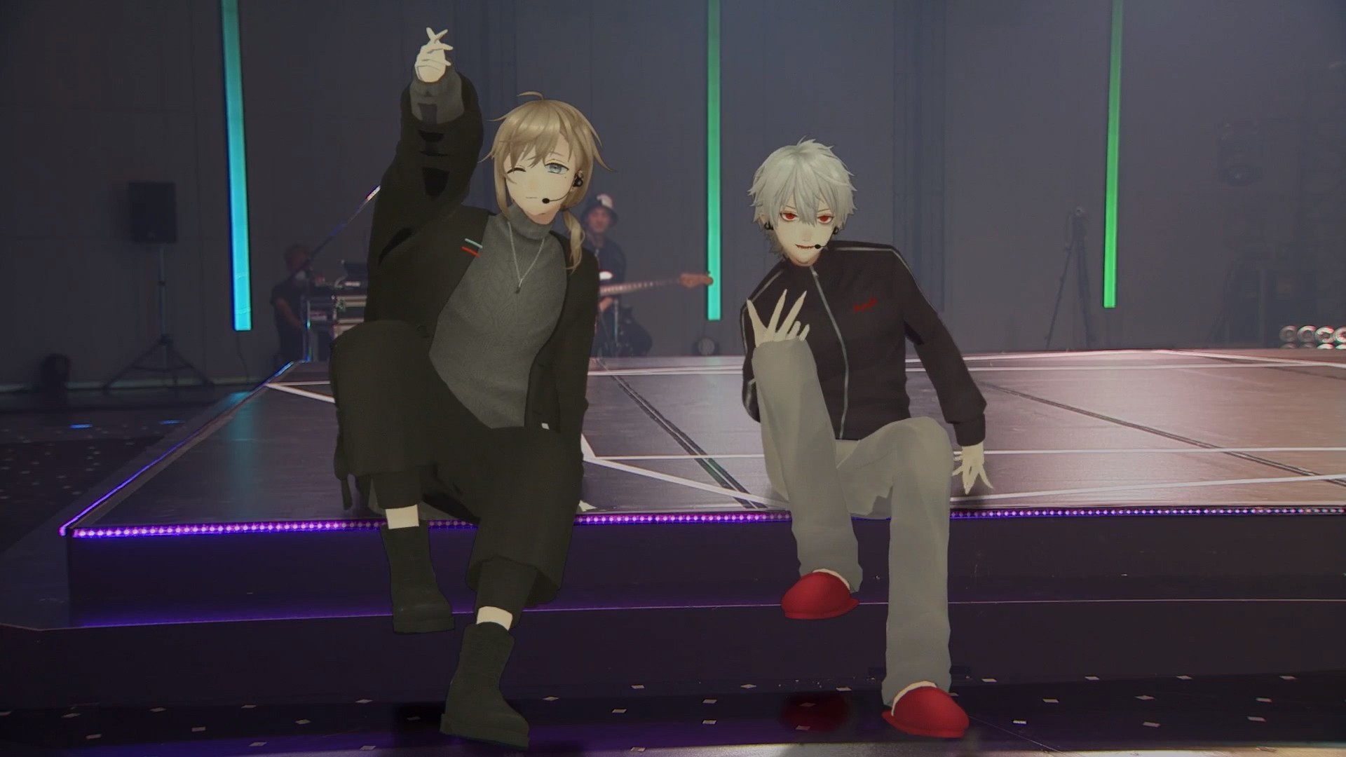 再び5曲続けて歌った所でMCパートへ。「ARならではってことで、やっぱこの段差使いたくなるよね〜」「他に段差を活用してたヤツ、おる?」と再び座り込みながら振り返りつつ、叶の衣装についても触れる。「えっ、まだ君パジャマなの?」「いや、オレなんかスリッパよ」と煽ったりといつもの悪ノリが3Dで行われてるのをニコニコしながら見ていると「次の曲は葛葉さんなんでしょ?じゃ、頑張って!」ということでライブも中盤戦へ差し掛かる。