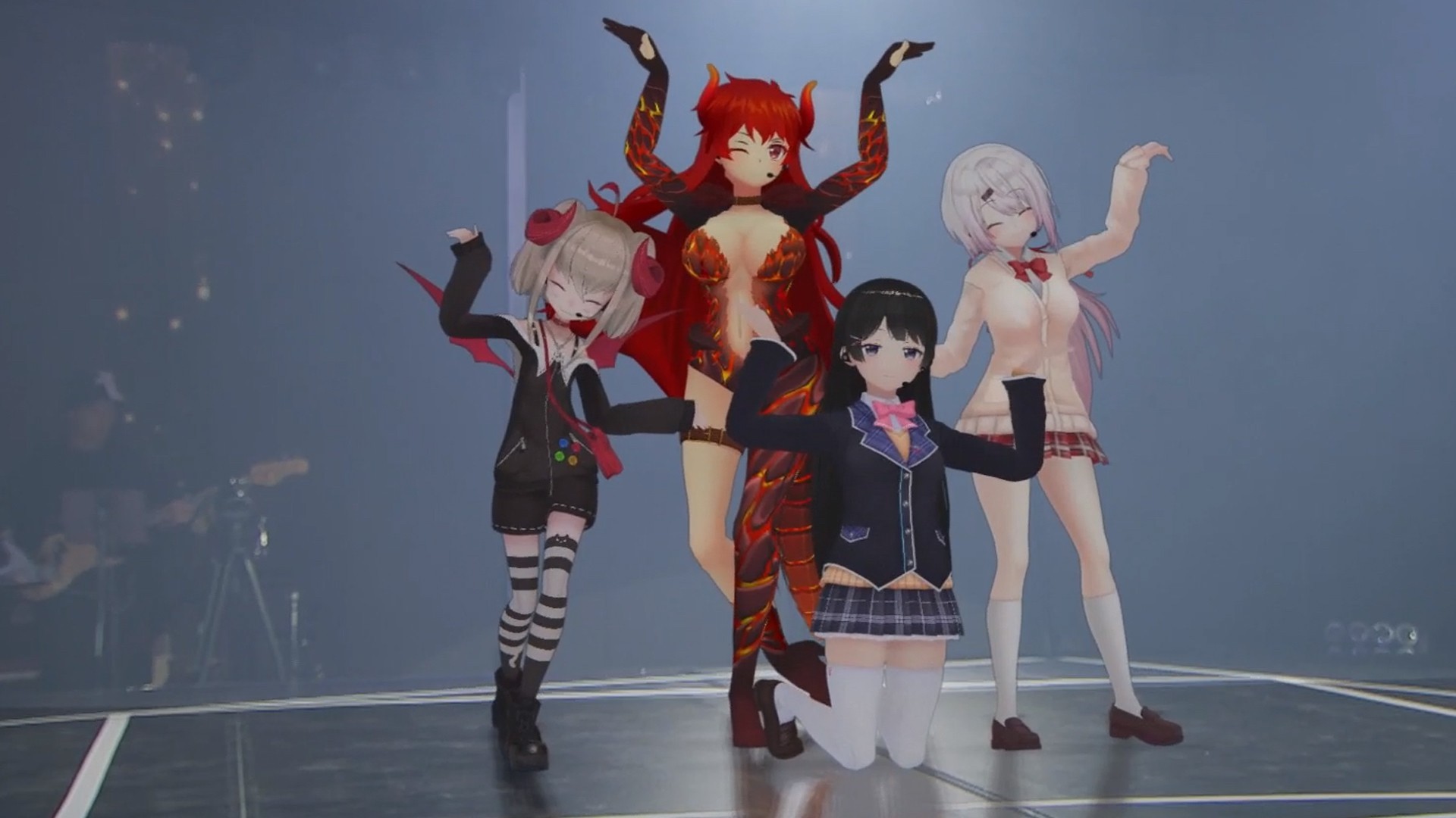 続く「Virtual Strike」は剣持とドーラによる歌唱だったが、2人ともボーカリストとして特徴的な伸びやかな歌声を披露し、特に剣持は前述のボイトレの成果をよく感じられるパフォーマンスだったと思う。また、同曲はにじさんじ3周年記念楽曲ということでライブも終盤に差し掛かっていることを感じつつ、続いては月ノ美兎/ドーラ/椎名唯華/魔界ノりりむの女子メンバーが勢揃いしてTVアニメ『ガヴリールドロップアウト』OPの「ガヴリールドロップキック」をカヴァーした。ハイテンションでとにかくわちゃわちゃした楽曲だが、この曲を生バンドで演奏できることにまず驚くし、各自のキャラにあったパート割りで、まるで持ち曲のように聞こえたほどだった。
