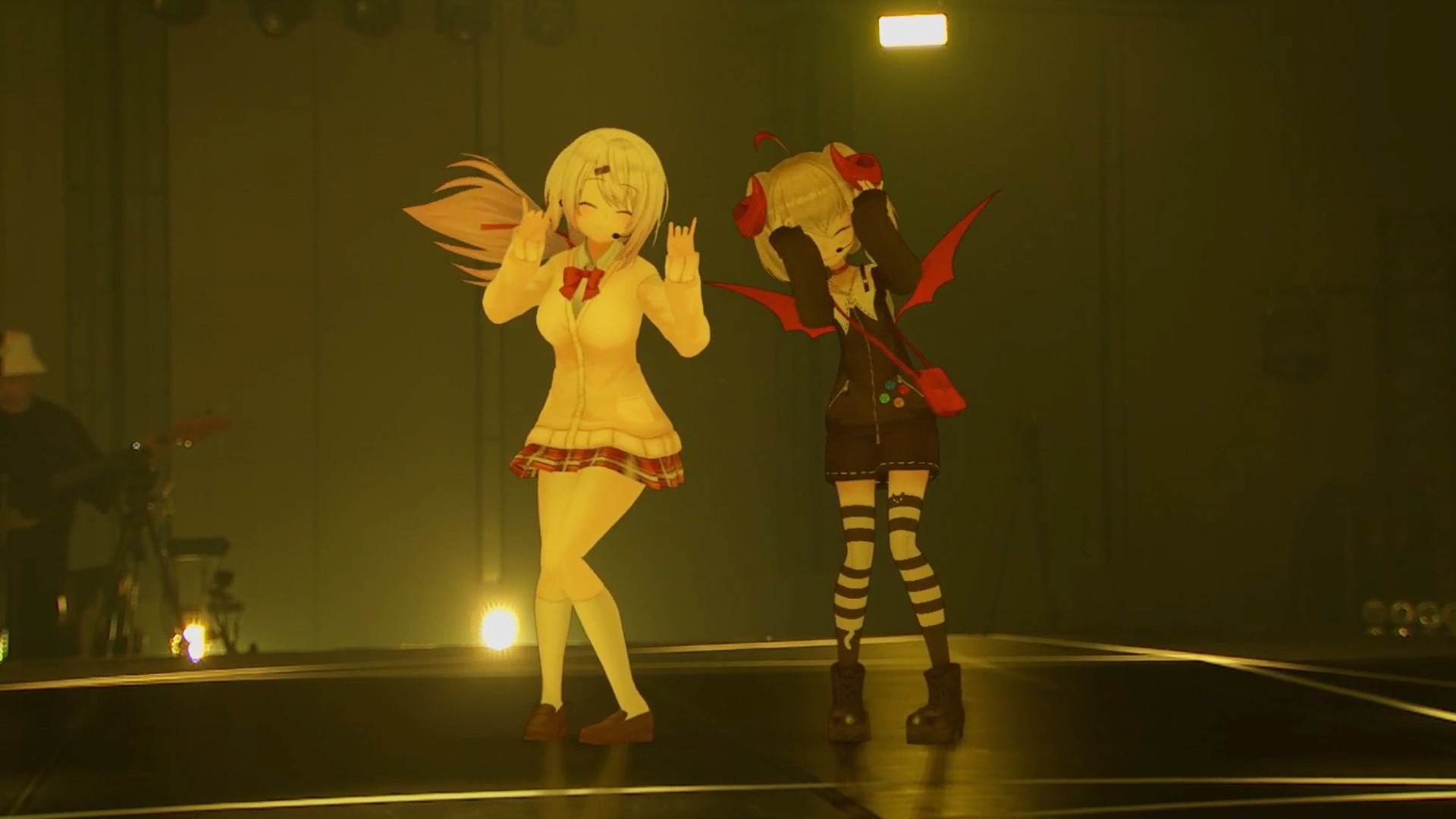 ここへ来て満を持して現れた月ノ美兎が「どうも有料の女、月ノ美兎です」と挨拶すると、「どうも、無料の女です」と応じるドーラのコンビでカヴァーしたのは°C-uteの「まっさらブルージーンズ」。ステージを大きく使ったキレッキレのダンスを披露し、ARライブの利点を最大現に生かしたパフォーマンスを繰り広げると、続いて登場した葛葉、叶のChroNoiRコンビはOfficial髭男dismの「宿命」をカヴァー。2番に入ると段差に腰掛け、互いに語りかけるように歌う姿に思わず涙がこぼれそうになる。
