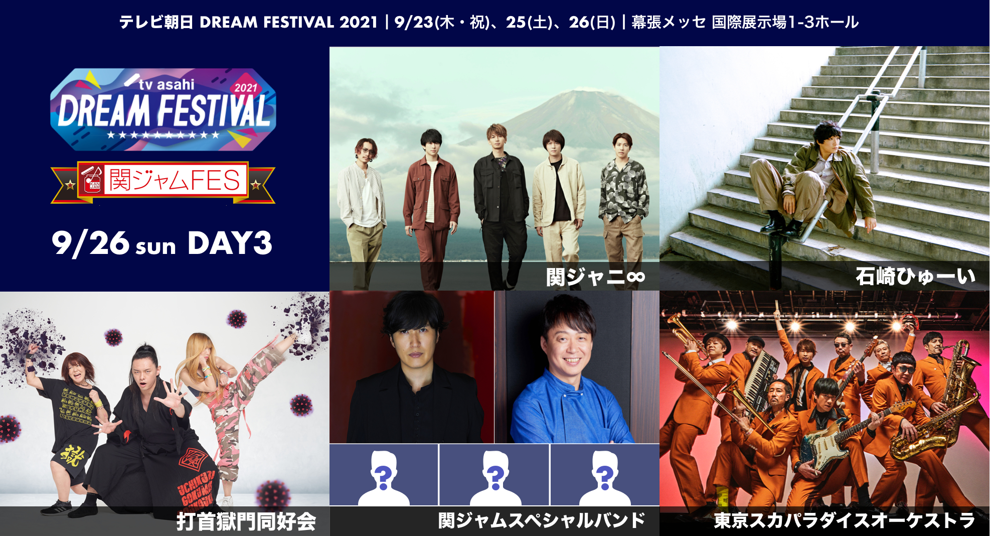 2021年9月23日(木・祝) ・ 25日(土) ・ 26日(日)に千葉・幕張メッセ 国際展示場1・2・3ホールで開催される『テレビ朝日ドリームフェスティバル2021』にて、『関ジャムFES』が行われることがわかった。