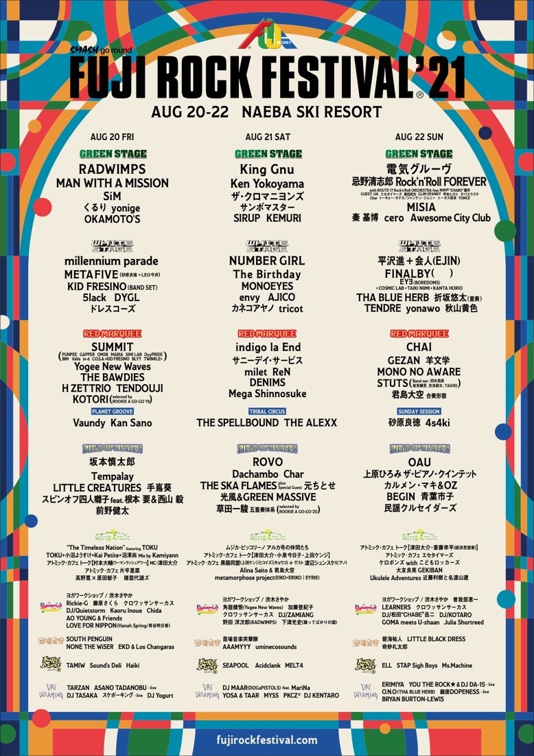 また、オフィシャルラジオ各局の特番オンエア情報も発表された。InterFM897では8月16日〜20日の7:00より『Simple day PRODUCT FROM Causette.Joli presents Keep on FUJI ROCKIN’』、16:30からは『Simple day PRODUCT FROM Causette.Joli presents Fuji Rock Festival MIX』、J-WAVEでは8月22日13:00より『J-WAVE TOKIO HOT 100』、FM COCOLOでは8月15日17:00より『Whole Earth RADIO「2021年版フジロック徹底ガイド」』、8月22日17:00からは『Whole Earth RADIO 「フジロック!苗場にズームイン」』、FM802では9月10日20:00より『802 BINTANG GARDEN「Landscape of – FUJI ROCK FESTIVAL ‘21-」』が放送される。