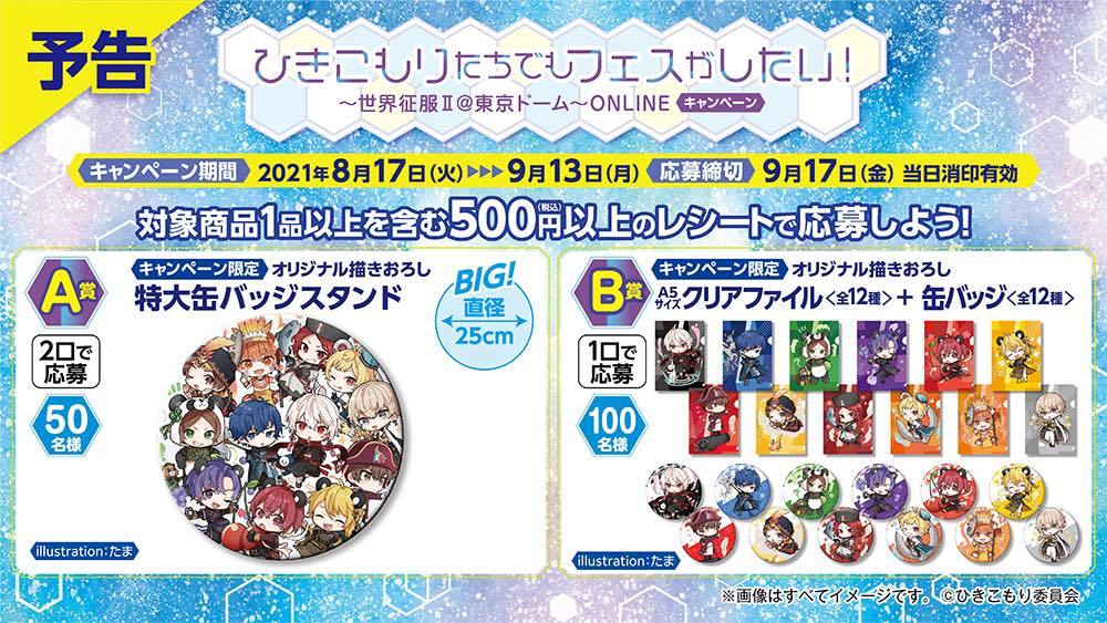 ファミリーマートで8月17日より、『ひきこもりたちでもフェスがしたい!~世界征服Ⅱ@東京ドーム~ONLINE~』キャンペーンが開始される。対象商品の購入で限定のオリジナルグッズがもらえるキャンペーンのほか、抽選でスペシャルグッズが当たる応募キャンペーンが実施される。