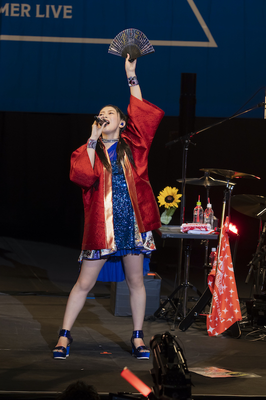 この熱狂から一度会場は暗転する。そして再び光が灯った会場に現れたのは真っ赤な法被を羽織り手に扇子を持った茅原の姿だ。高いテンションの中にある会場で彼女が披露したのは「美歌爛漫ノ宴ニテ」だった。上がりきったテンションを日本伝統の祭りというスタイルに転嫁して会場をこれまでと一風変わった形の興奮の坩堝に落とし込む。