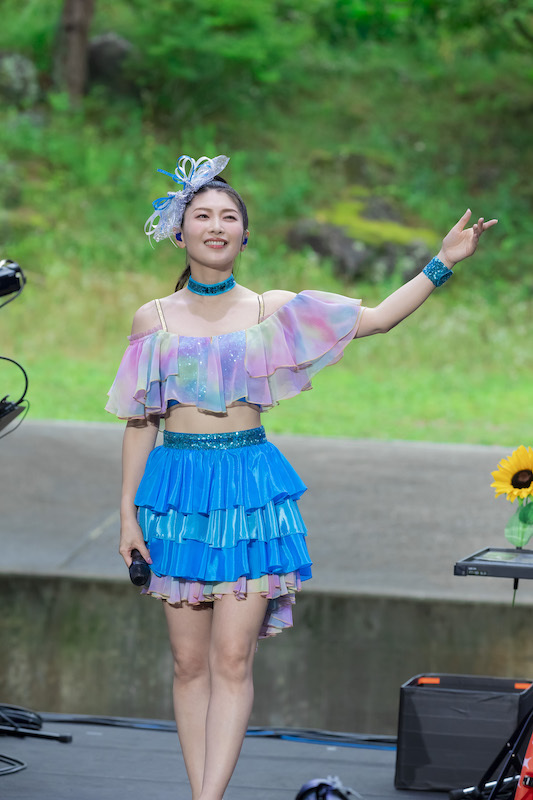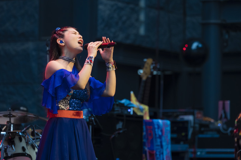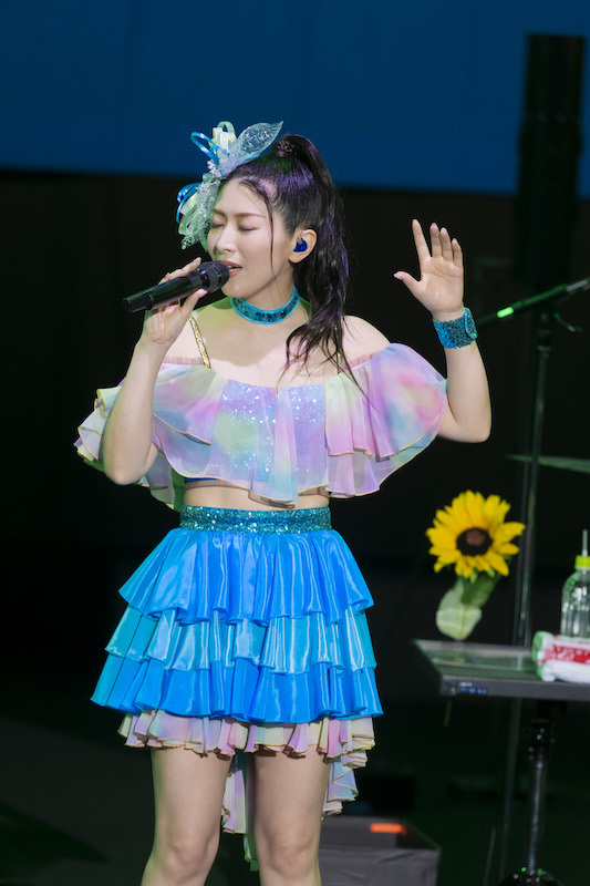 そこから次の曲に向けて優しい鈴の根が鳴り響く。アコースティックコーナーの二曲目を飾ったのは「Joyful Flower」。その多幸感溢れるサウンドに彼女の歌声が乗り、さらなるハッピーな空気が会場中を駆け巡る。そして曲に合わせて彼女が旗を振ると観客もそれに合わせて旗を振る、会場中が彼女の指揮する楽団のような一体感を帯びたのであった。