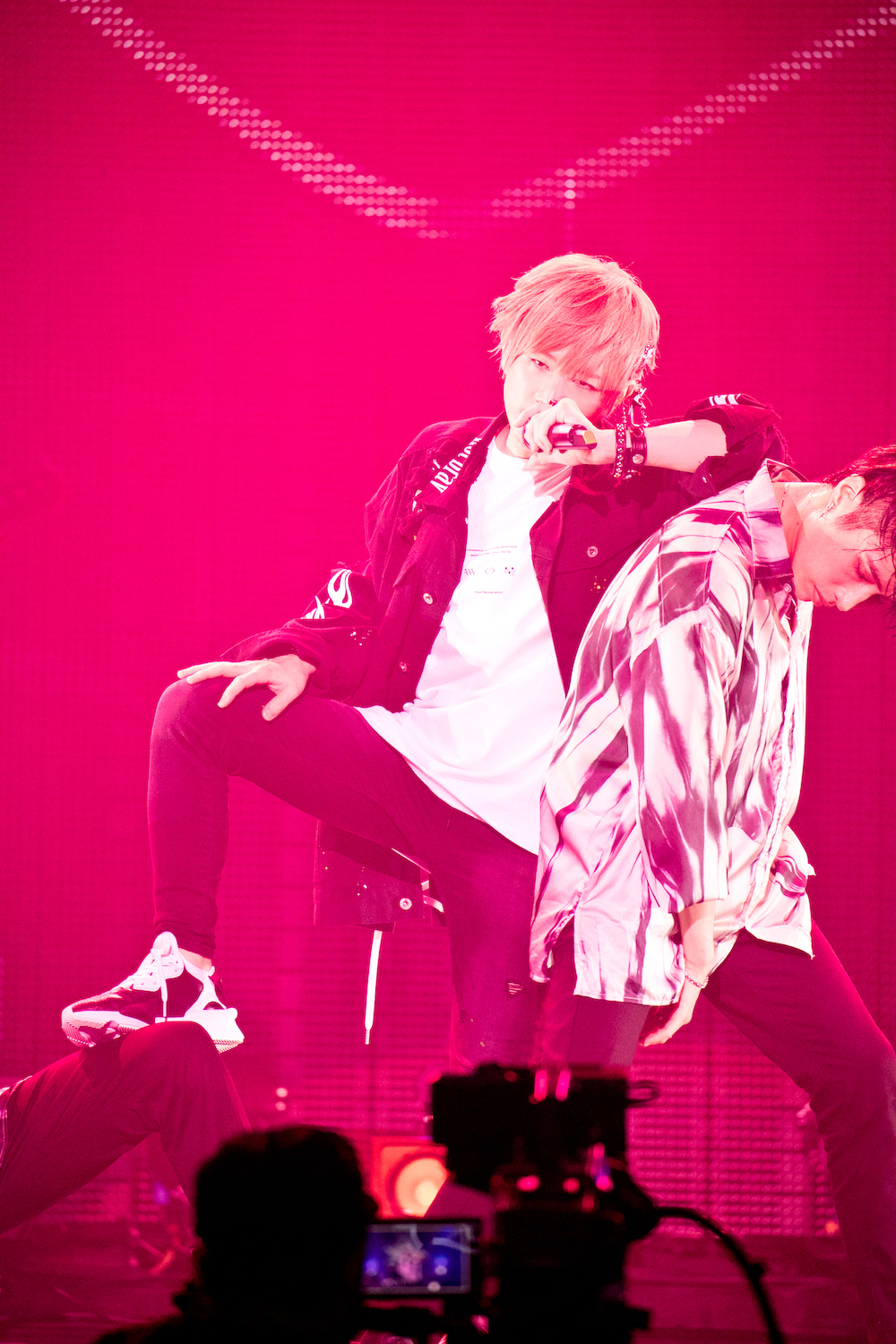 巻き舌フレーズも映える「ヴィラン」をはさんでの2曲は、『date.』に収録のナンバーで、高揚感をたたえた「MAKE WITH LOVE」。<お前に決めた> <お前がいい>と、画面の前にいるこたぬきをひとり残らずロックオンした「愚かなオルカ」。ドローンカメラを追う目線、オトナな歌詞にもドキドキしてしまうし、続く「Pink」での挑発的なダンス、軽々と跳躍してきめるキック、シャツの裾からちらりと見える素肌にも、色気がダダ漏れだ。