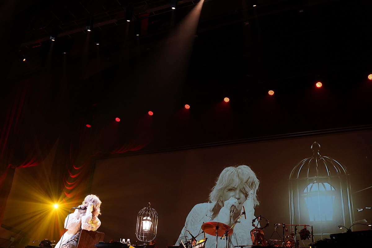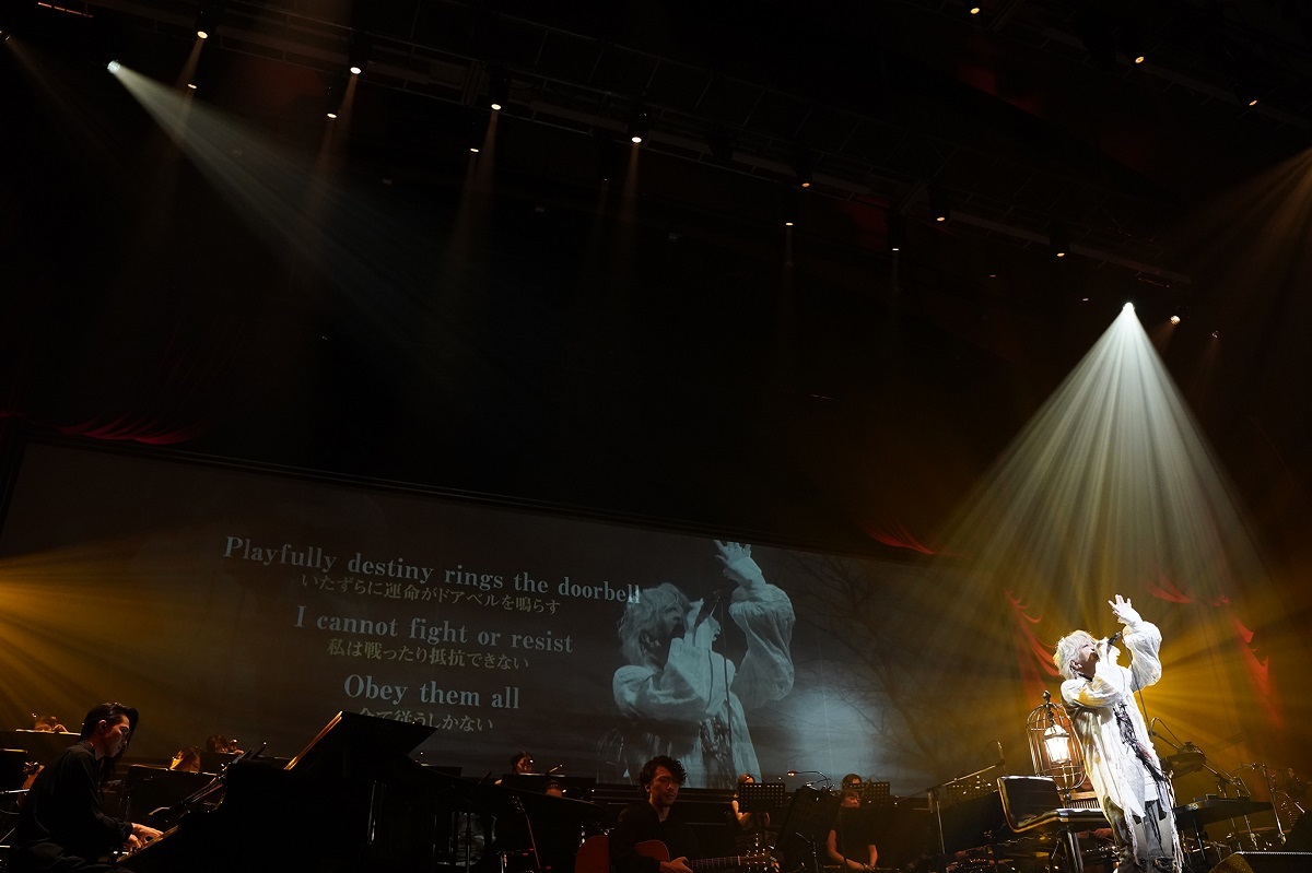 『ROENTGEN』 から3曲を披露した後は、現在制作中の『ROENTGEN 2』から「哀しい内容だけどかわいらしい曲に仕上げた」という「SMILING」と、奈落の底のような絶望を感じさせる「THE ABYSS」を。HYDEの歌声は哀しみ、絶望、切なさ、儚さ…と次々に表情を変え、観客の五感を捉えて離さない。派手なセットも特殊効果も凝った映像も無いシンプルなステージが、豊かな色彩を携えたHYDEの歌声とオーケストラの音色で満たされていく。