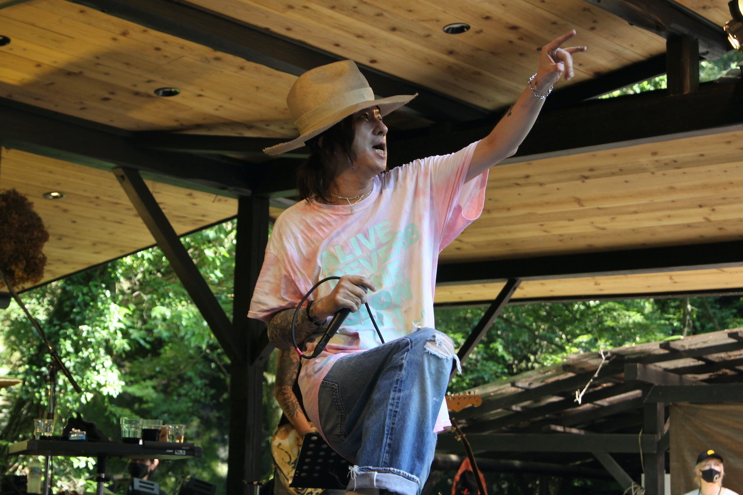 ライブフォレストステージ、15時開始は清春BAND SET。昼間の屋外イベントとは縁遠いイメージの清春だが、タイダイのTシャツにダメージジーンズという夏らしいラフな装いでステージを裸足で駆け回り盛り上げる。レッド・ツェッペリンを彷彿させる重厚なサウンドに張り合うように、パワフルにシャウト。50分弱の持ち時間ではあったが、大きな存在感を残した。