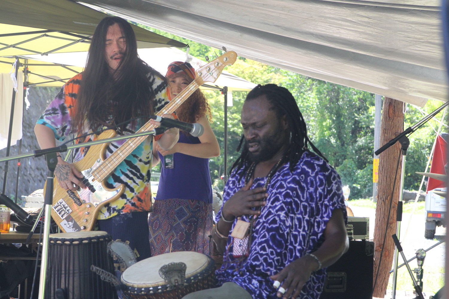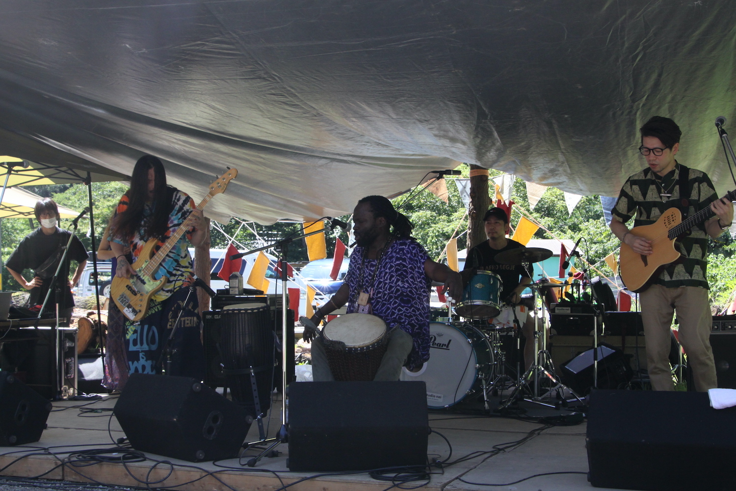 『深澤渓・自然人村』の入口からほど近い深沢ステージで喝采を浴びていたのは、ジェンベ奏者のオマール・ゲンデファル率いるアフロビートバンド、Afro Begue。津田 悠佑のギターがスリリングに鳴るなか、超絶ベーシストのKenKen、オマール、ドラムの佐々木俊之が織りなすグルーブは圧巻。観客は暑さをものともせず、力強いビートに身を任せていた。