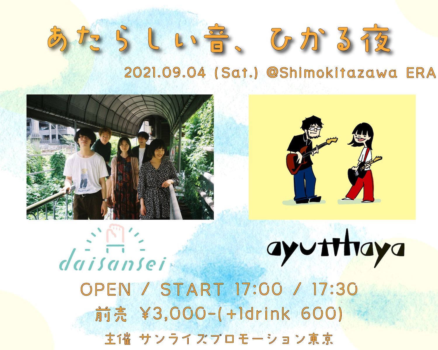 第1回目の出演アーティストは、2015年結成、太田美音(Vo/Gt)、右田眞(Ba)によるオルタナティブロックバンド・ayutthaya(読み:アユタヤ)と、「居場所のないあなたに添えるポップミュージック」を掲げる2019年結成の5人組ロックバンド・daisansei(読み:ダイサンセイ)が出演する。