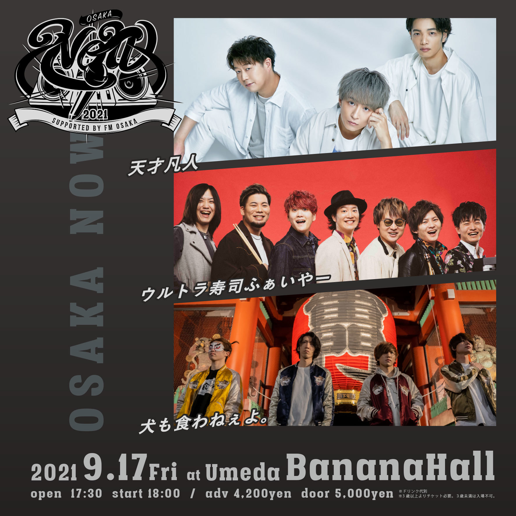『OSAKANOW』は、FM OSAKAとタッグを組み、大阪からボーカル系シーンを全国へ発信するライブイベント。今回出演するアーティストは、天才凡人、ウルトラ寿司ふぁいやー、犬も食わねぇよ。の3組。